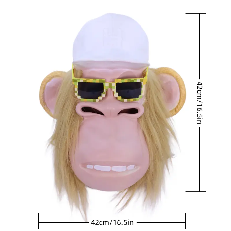 This full latex mask is inspired by a quirky yellow orangutan. It’s crafted with high‑realism techniques: light pink realistic skin tone, dense golden long fur, three‑dimensional large ears, paired with an integrated white baseball cap (embossed “H” logo) plus movable pixel sunglasses—every detail is meticulously rendered, perfectly capturing the orangutan’s adorable yet cool demeanor. Put it on and instantly transform into a "Trendy Gorilla Person." Whether it’s a quirky party or short video creation, you’ll become an instant focal point, and the humor is maxed out!