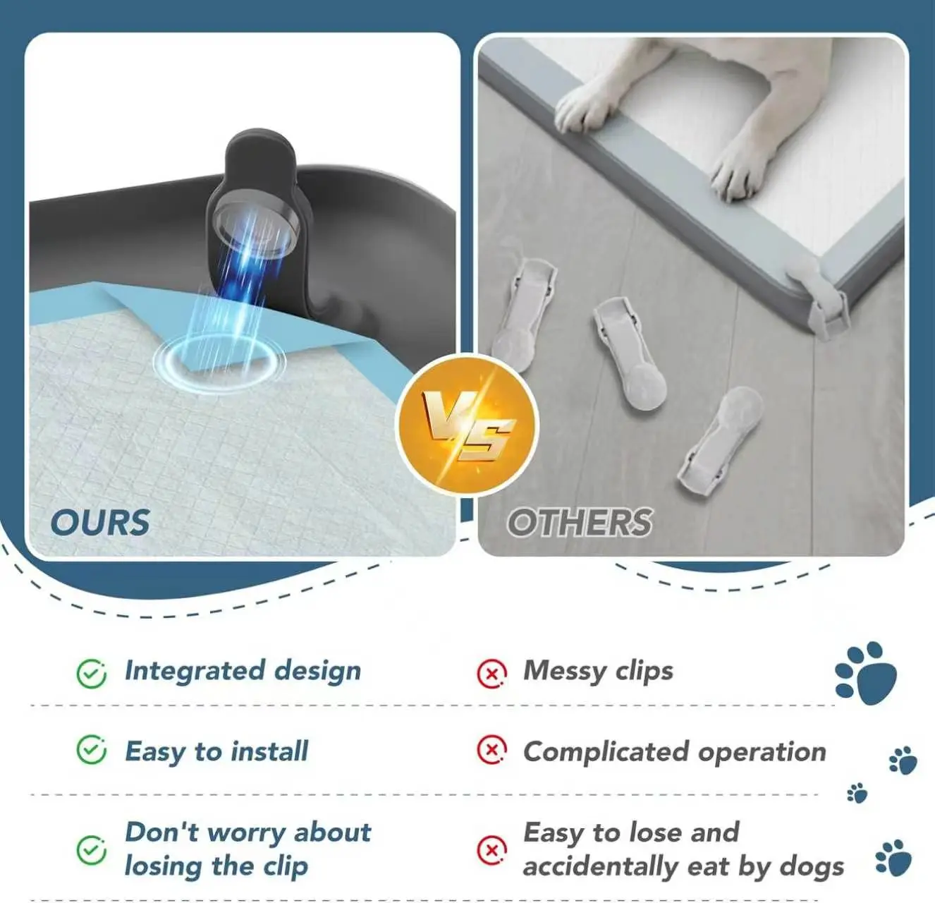 Our dog potty pad holder keeps your pee pads securely in place with the innovative corner lock whole that prevent wobbling and sliding, providing stability and peace of mind unlike other holders.