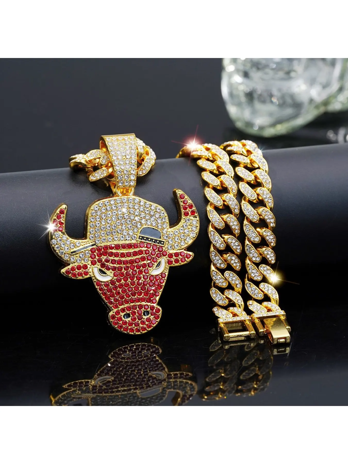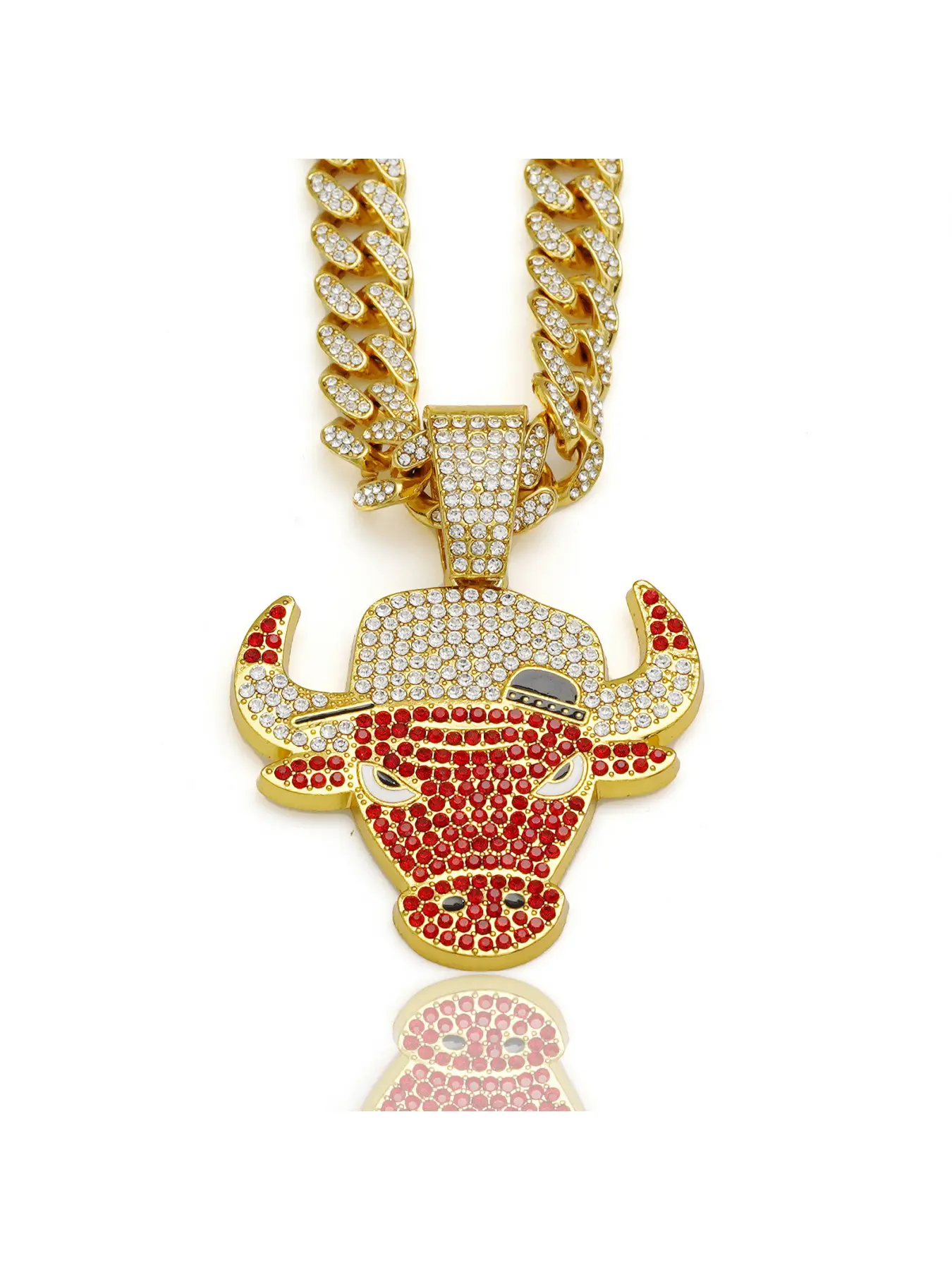 Men's hip-hop full-diamond necklace, fashionable and unique, with a cool red bull head pendant