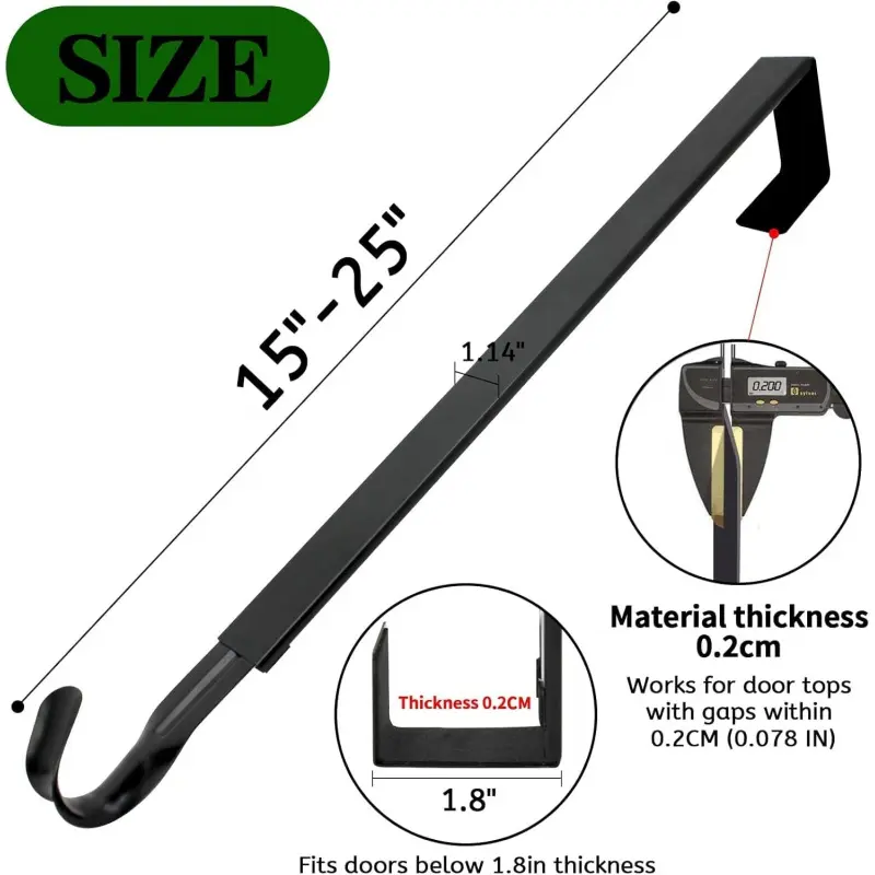 Adjustable wreath hanger from 15 to 25 Inches, width 1.14in, the hook thickness over is only 0.078 inch.