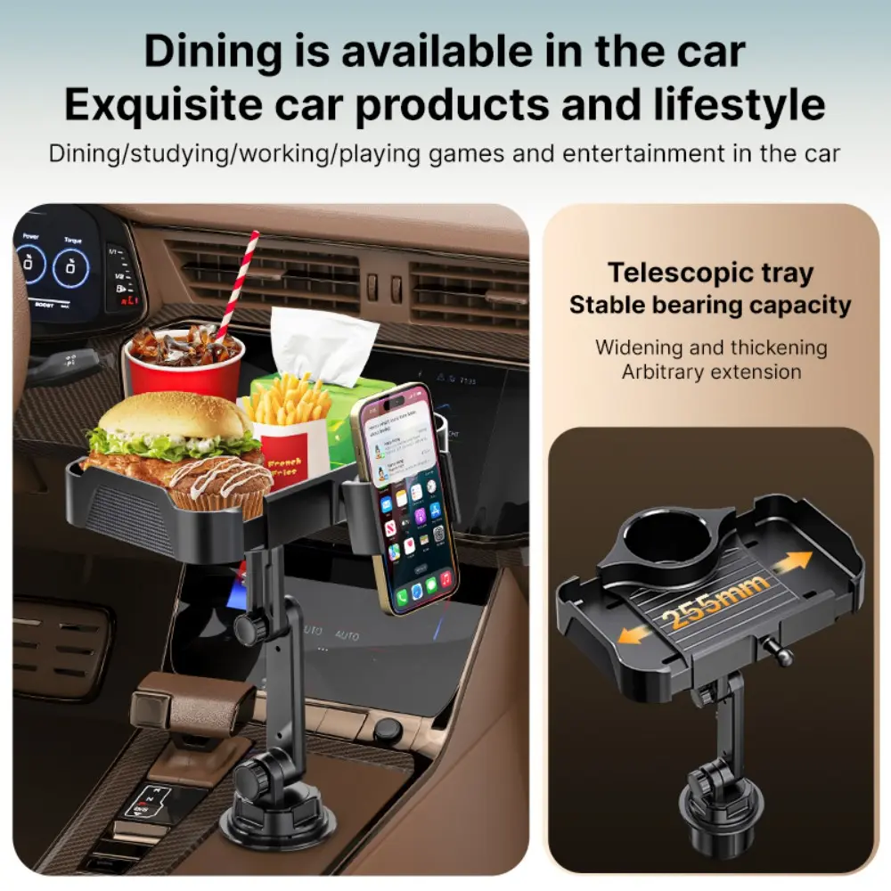 ✨ 4 in 1 Car Cup Holder Expander Tray with a phone holder. This tray offers 360° rotation for convenience. It's an extra-large food table tray, perfect for car console storage. The organizer box includes trays for phone and snacks. Ideal for road trips, this accessory is universal for most cars, SUVs, trucks, vans, and pickups.