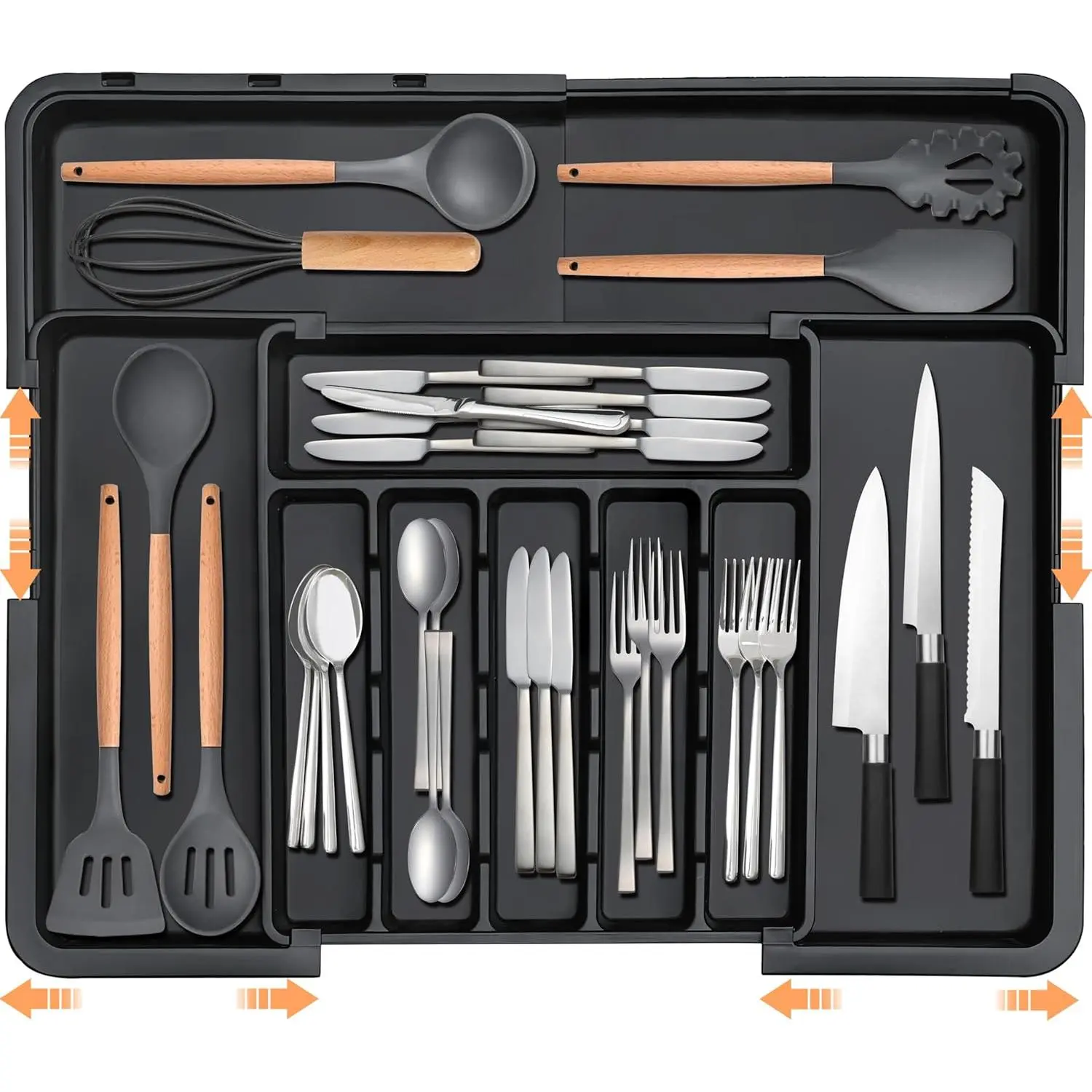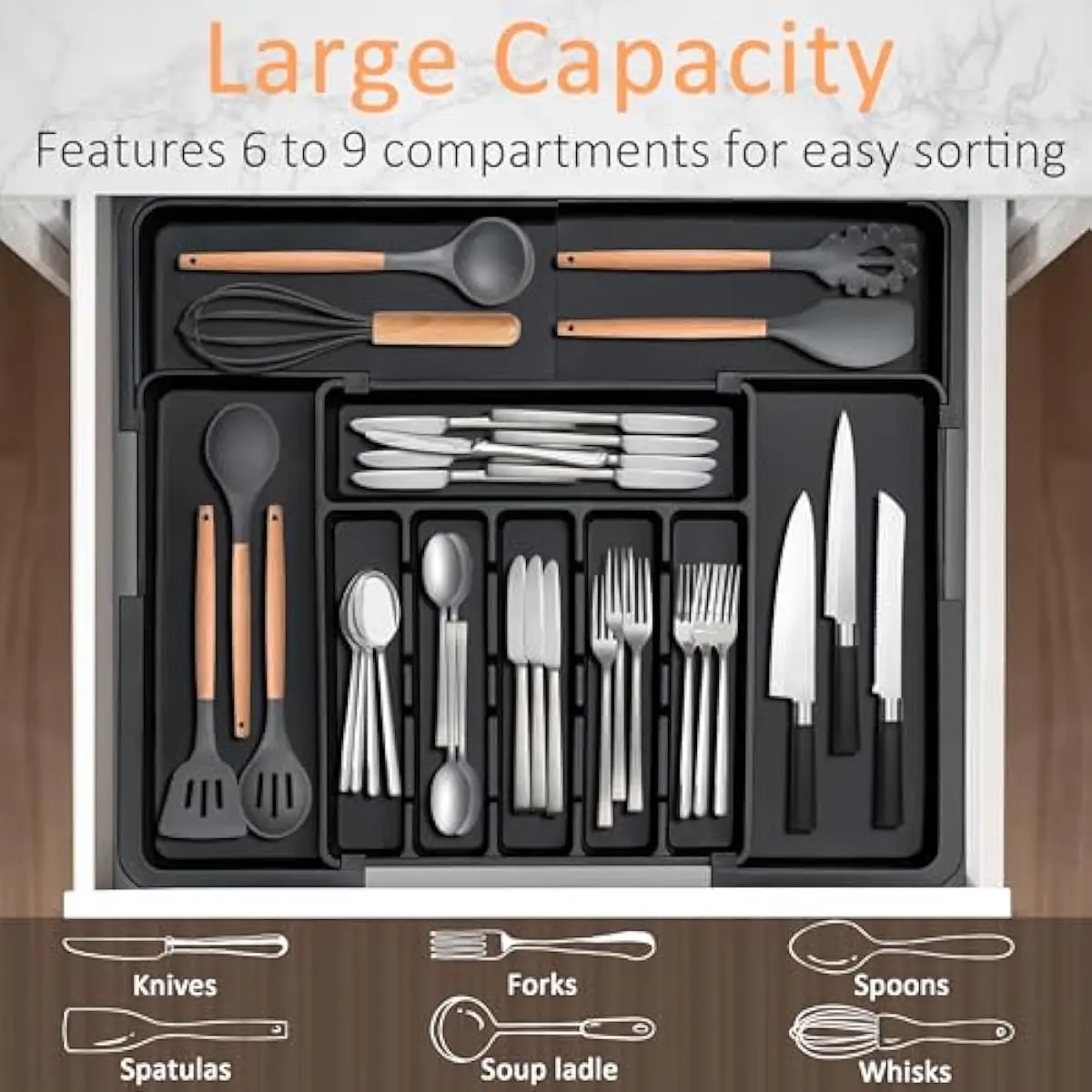 Our kitchen drawer organizer is simple to expand, transforming from 6 to 9 compartments. It features 6 main sections and 3 extra expandable slots, making it ideal for storing spoons, forks, knives and larger utensils like spatulas and tongs.