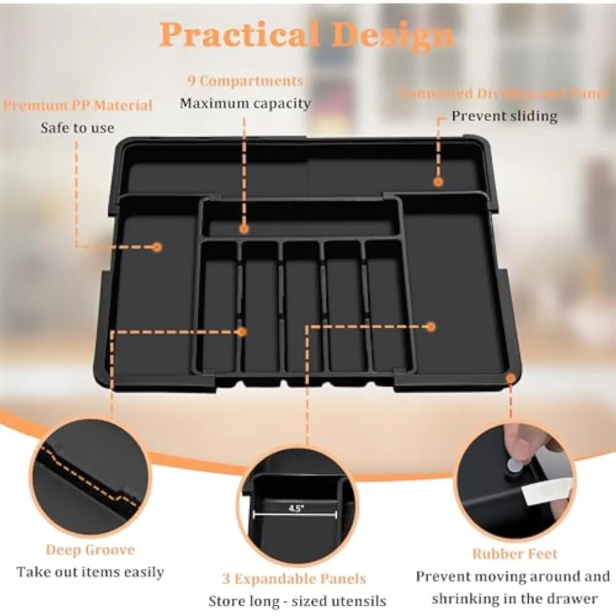 ·Premium Food Grade Material: The silverware drawer organizer for kitchen utensils is crafted from premium PP material that is BPA-free and long-lasting for use. Just rest assured that it can guarantee the safety of all your utensils, silverware, and flatware.