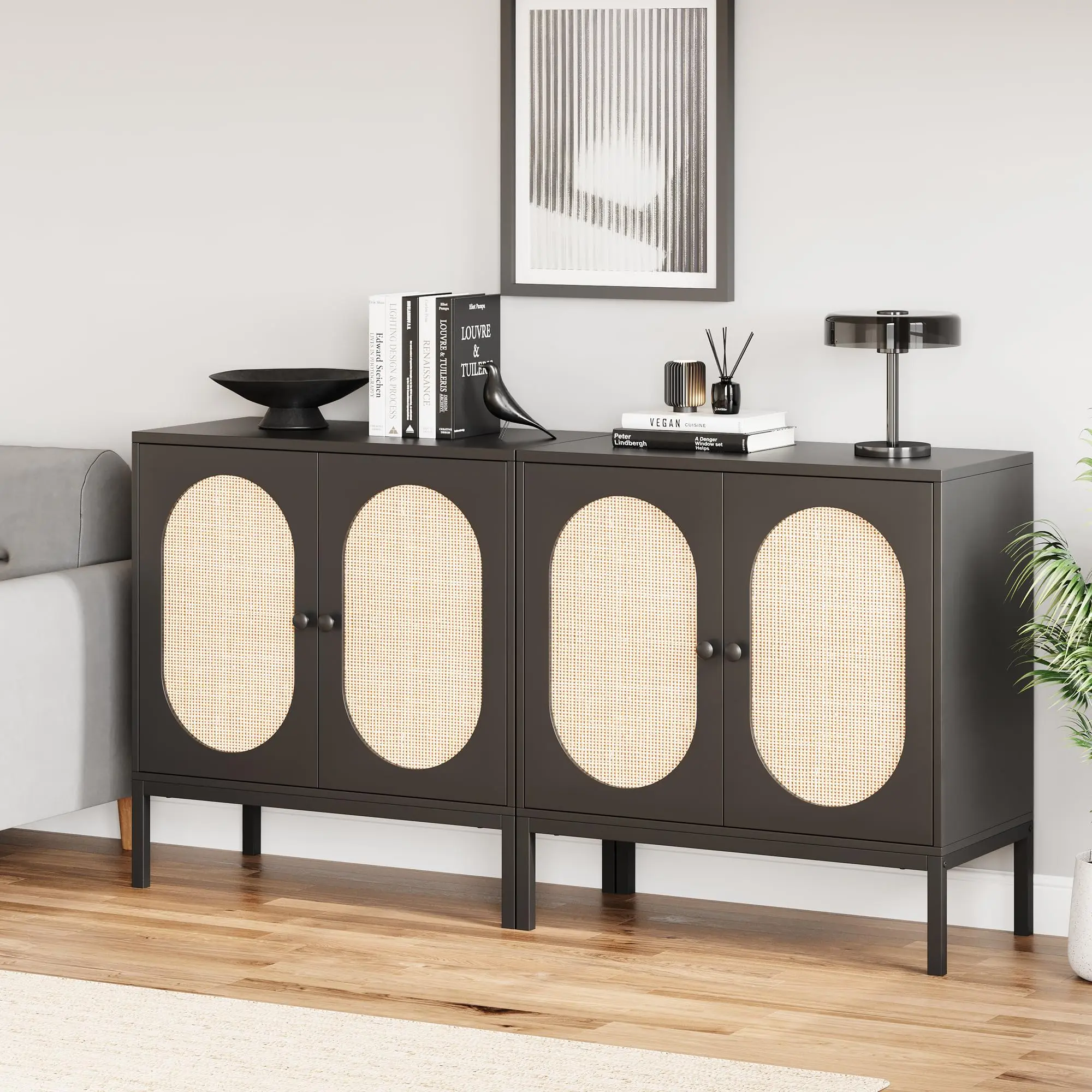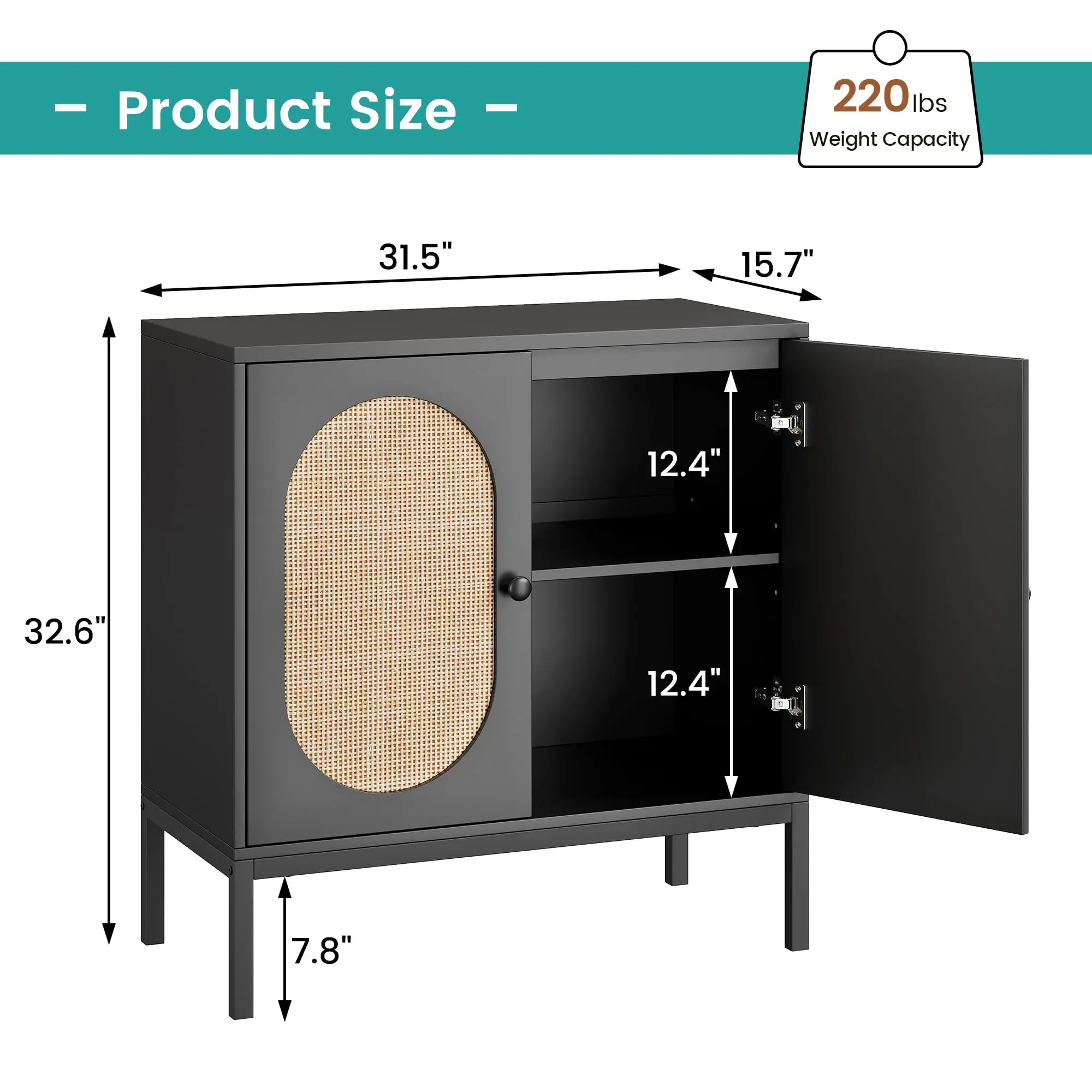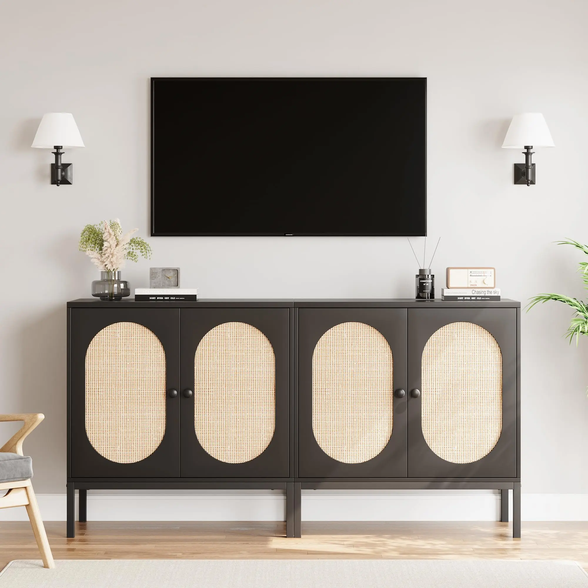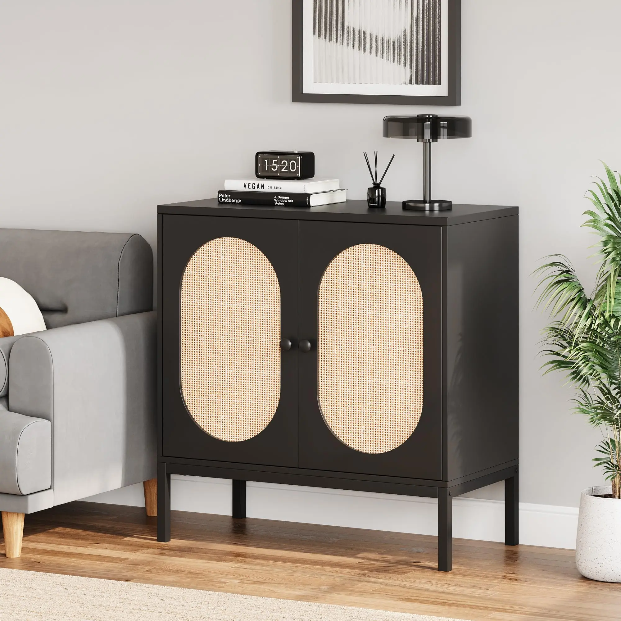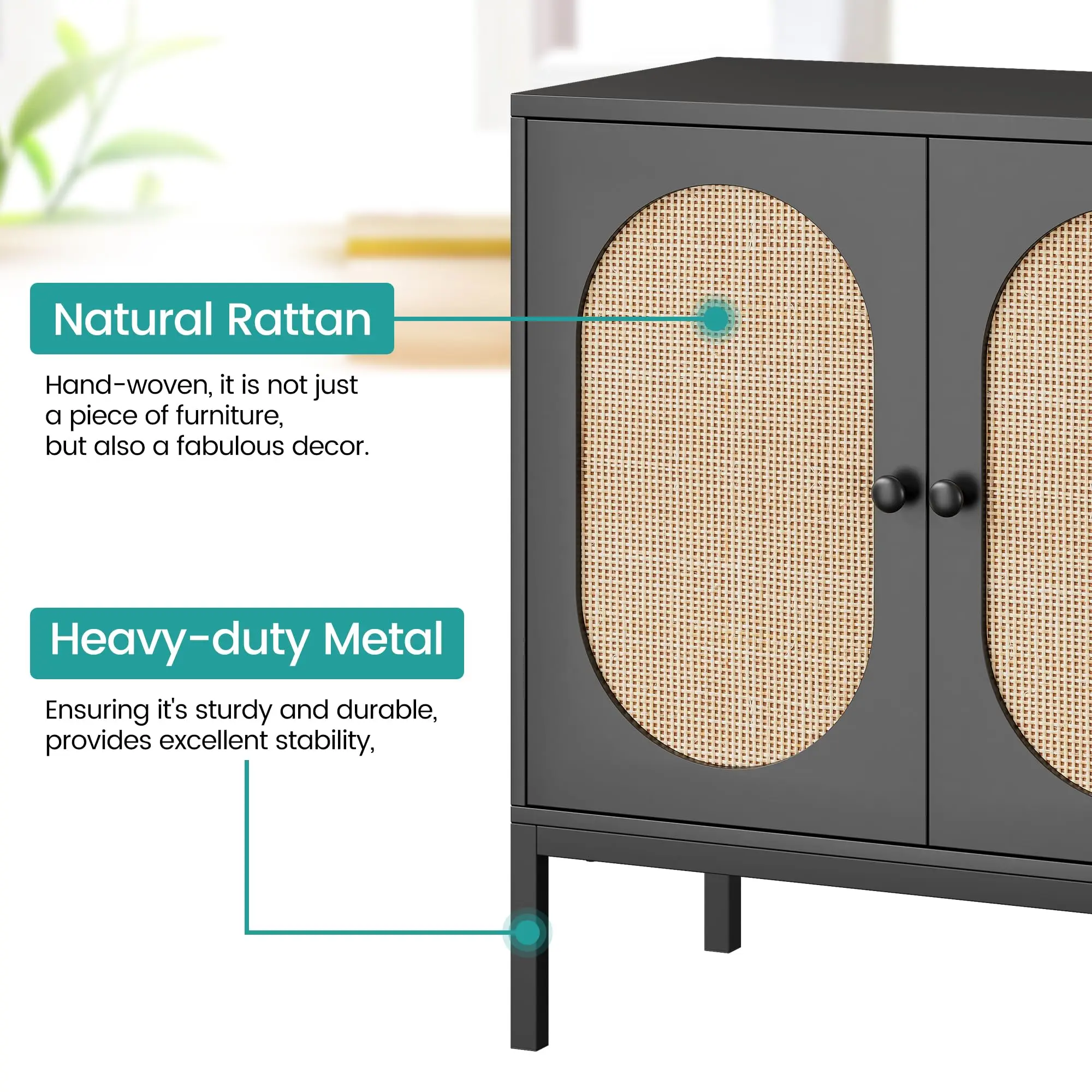 Garvee Black Rattan Sideboard Buffet Cabinet – Wooden Storage Console Table with Doors & Shelves, Plain Metal Feet, Boho Accent Furniture for Entryway, Hallway, Living Room, Dining Room, Kitchen –