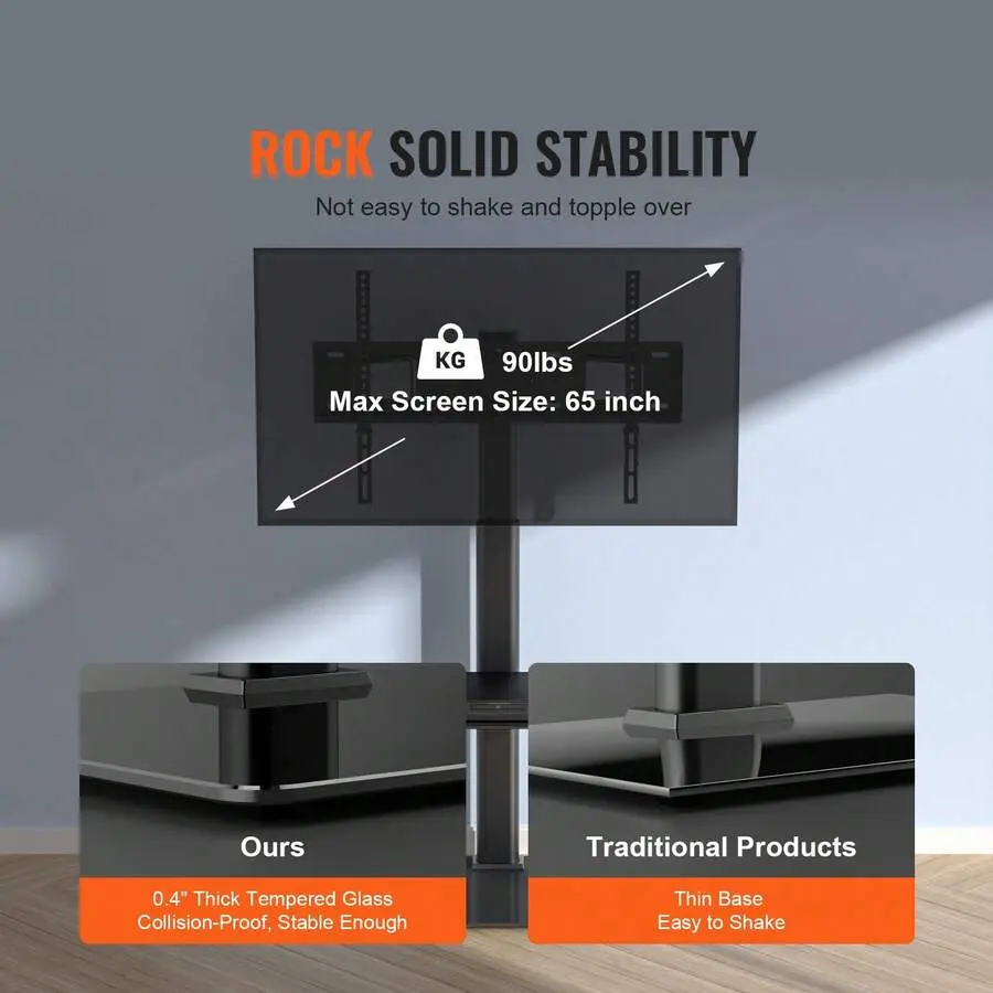 This universal floor TV stand combines safety, flexibility, and modern convenience to upgrade your viewing experience without wall drilling.Designed for bedroom, living room, dining room, and home office use, it delivers stable support and customizable angles for any space.