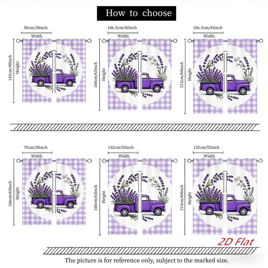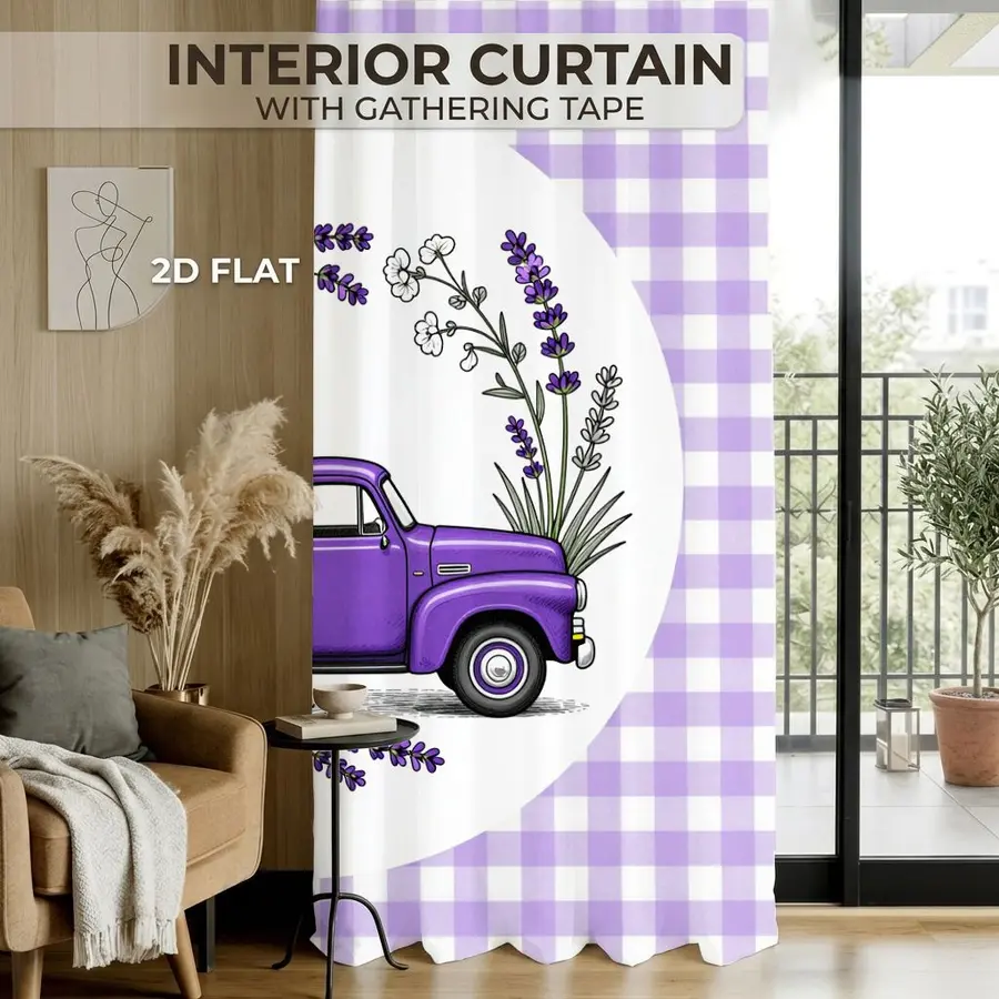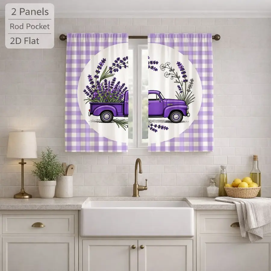 2Pcs Farmhouse Plaid Lavender Truck Floral Sun Blocking Curtains Digital Printed Rod Pocket, Window Treatment For Bedroom Office Kitchen Living Room Study Home Decor