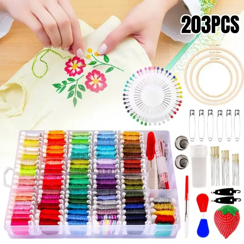 203pcs Rainbow Colored Embroidery Floss Sewing Thread Kit, Embroidery Thread with Storage Box, Include Cross Stitch Tools & 3 Embroidery Hoop, 100 Color Sewing Threads for Cross-Stitching And Embroidery, DIY Crafts, Ideal for Sewing Projects