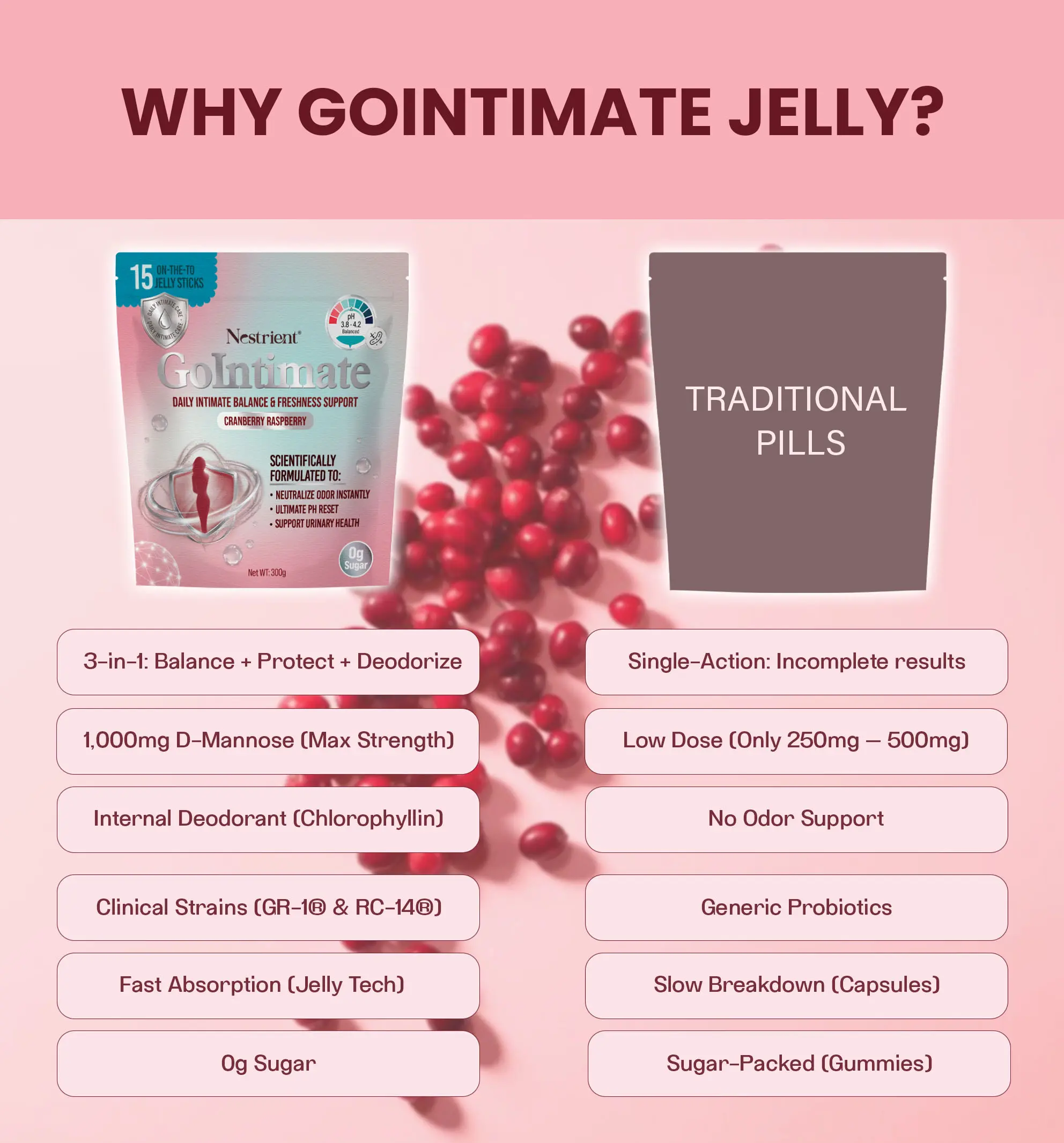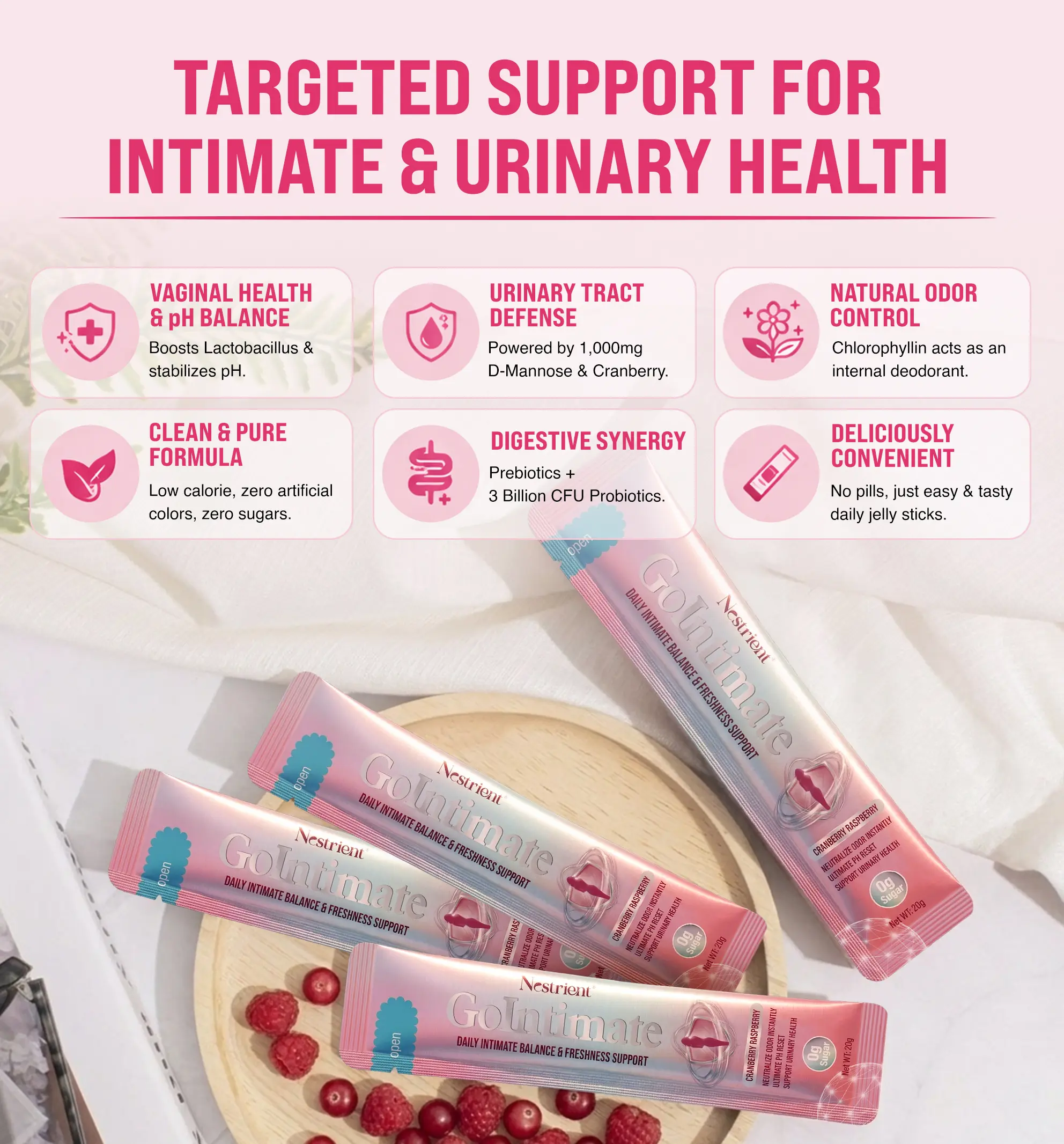 Stop settling for discomfort and start feeling your best from the inside out! GoIntimate Jelly Sticks are your delicious, on-the-go solution for complete intimate wellness. No pills, no water, just pure confidence in one tasty stick.