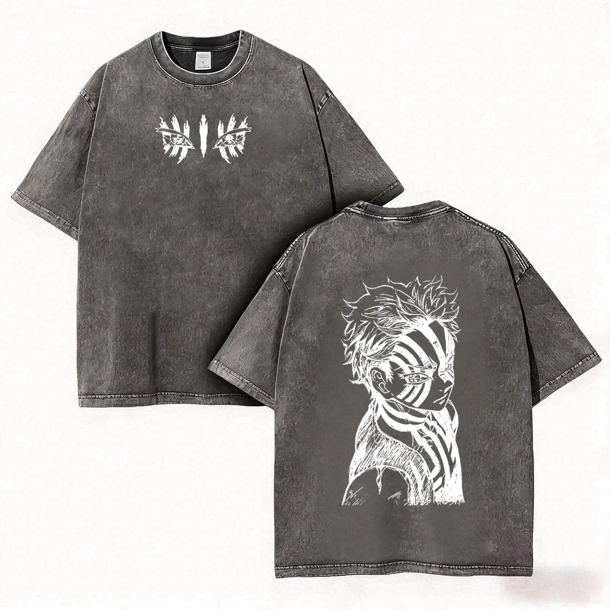 Classic oversized/boxy fit that flatters all body types, offering a comfortable, laid-back silhouette. The washed black base makes the bright white portrait and eye graphics pop, creating a striking, high-contrast streetwear aesthetic. Easy to pair with jeans, cargo pants, or sneakers for a versatile, anime-ready outfit. Unisex design works for men, women, and teens!