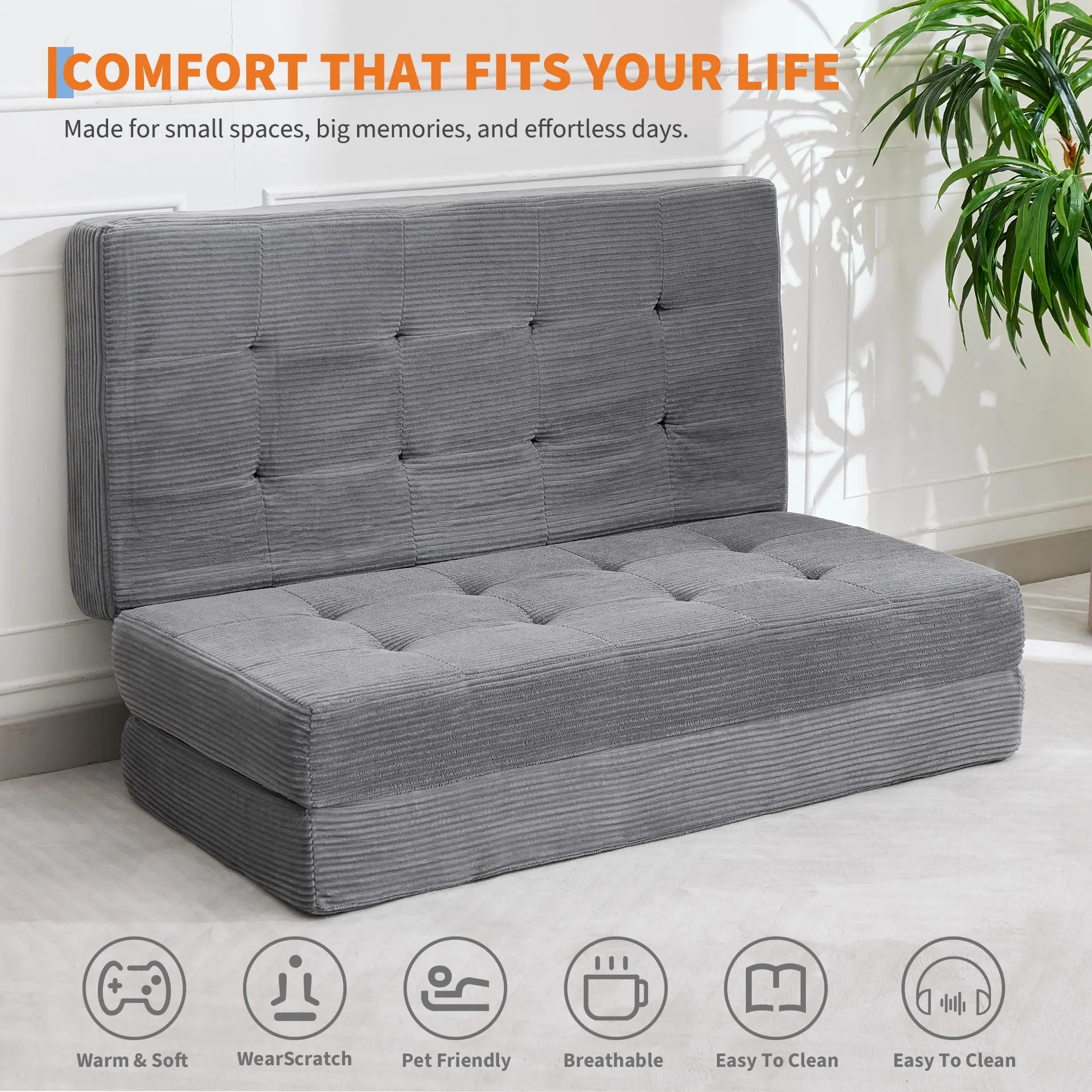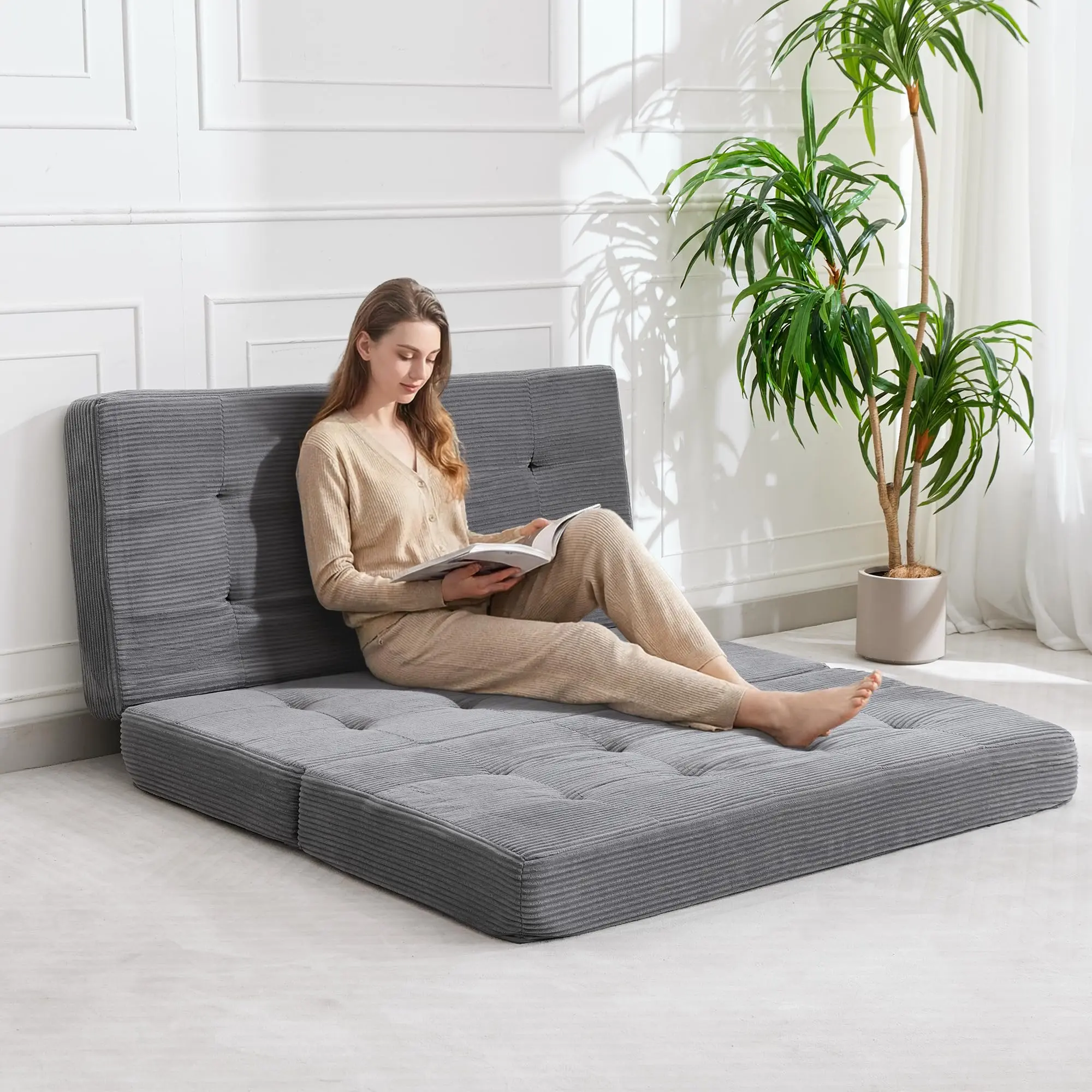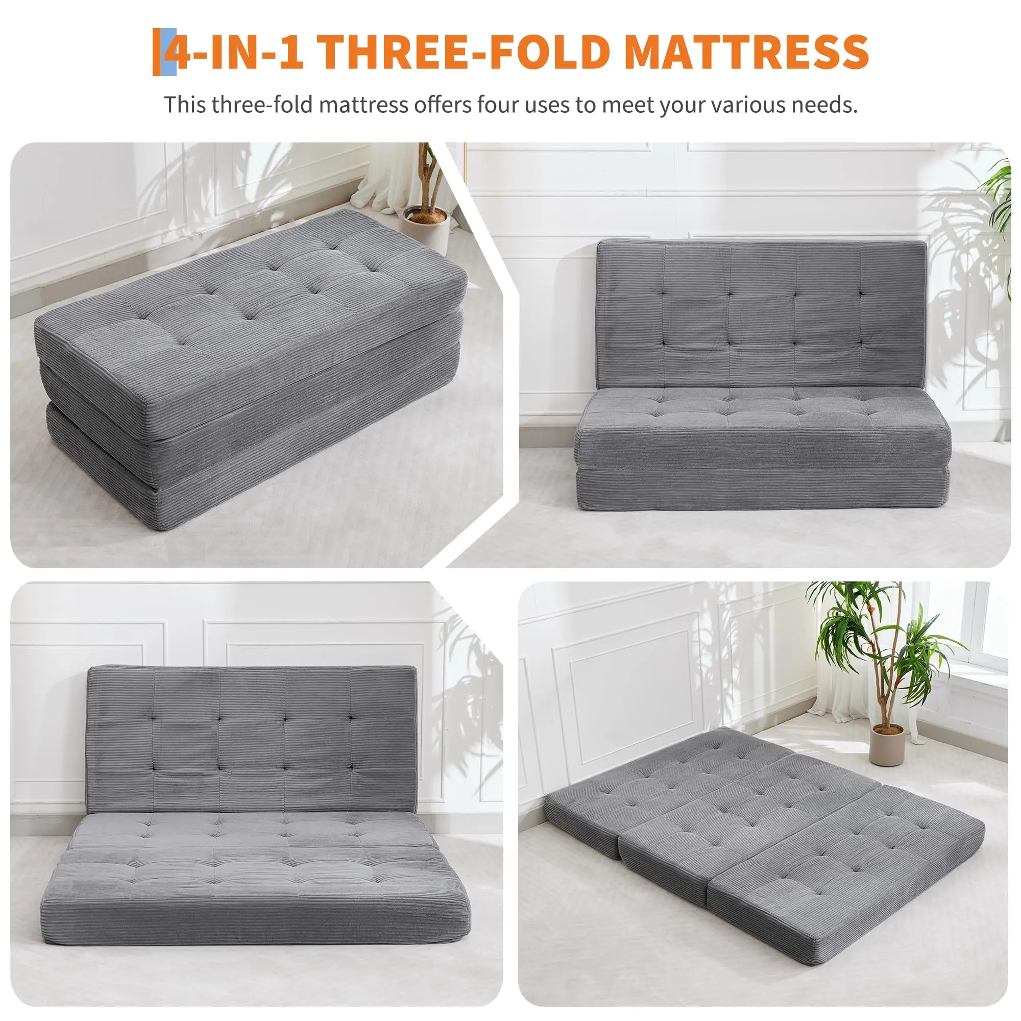 Garvee 6-Inch Tri-Fold Mattress with High-Density Support Foam, Foldable Floor Sofa Bed, Soft Corduroy Fabric, Tufted Design, Portable Guest Bed for Camping, Dorm, Living Room, Grey, 75" x 54.3"