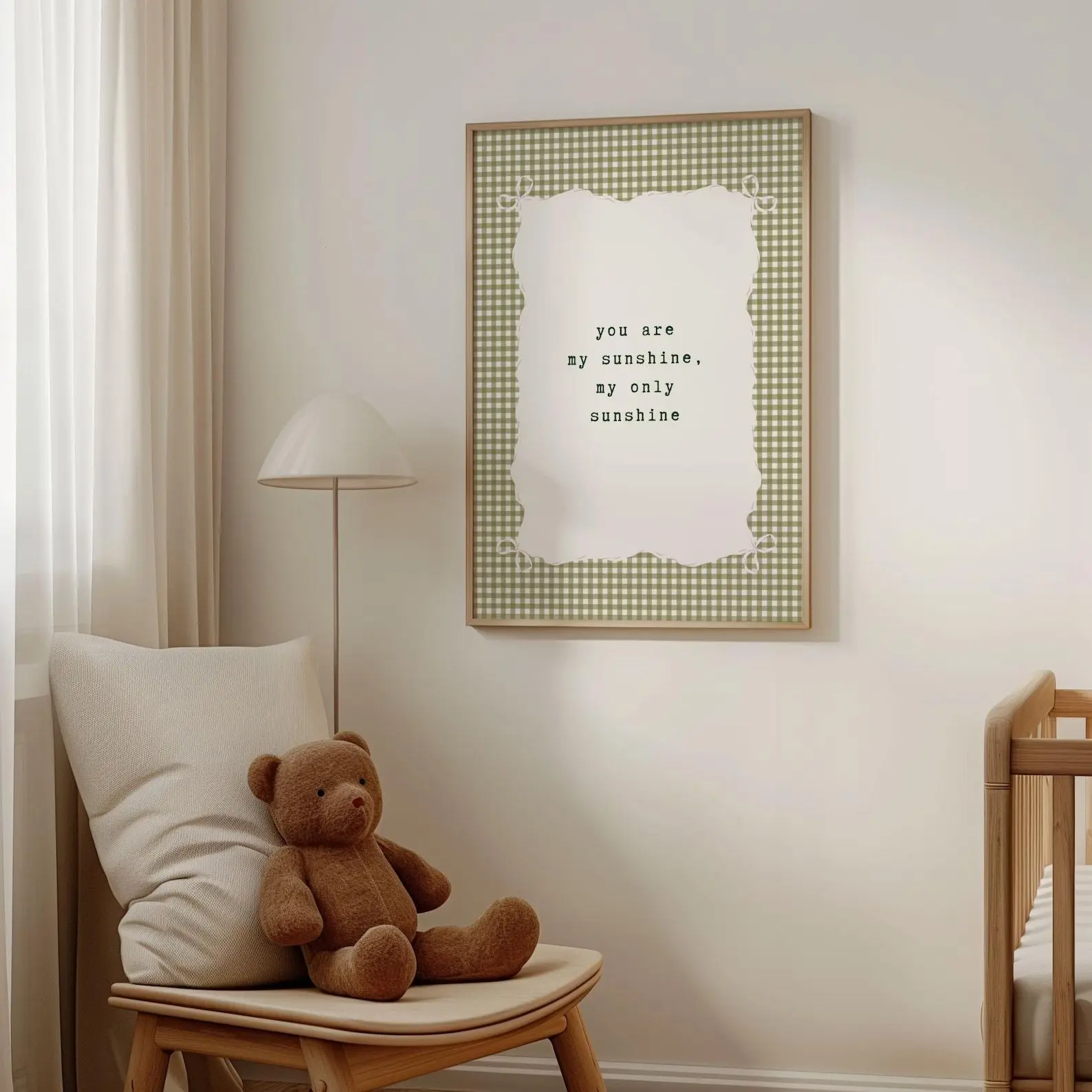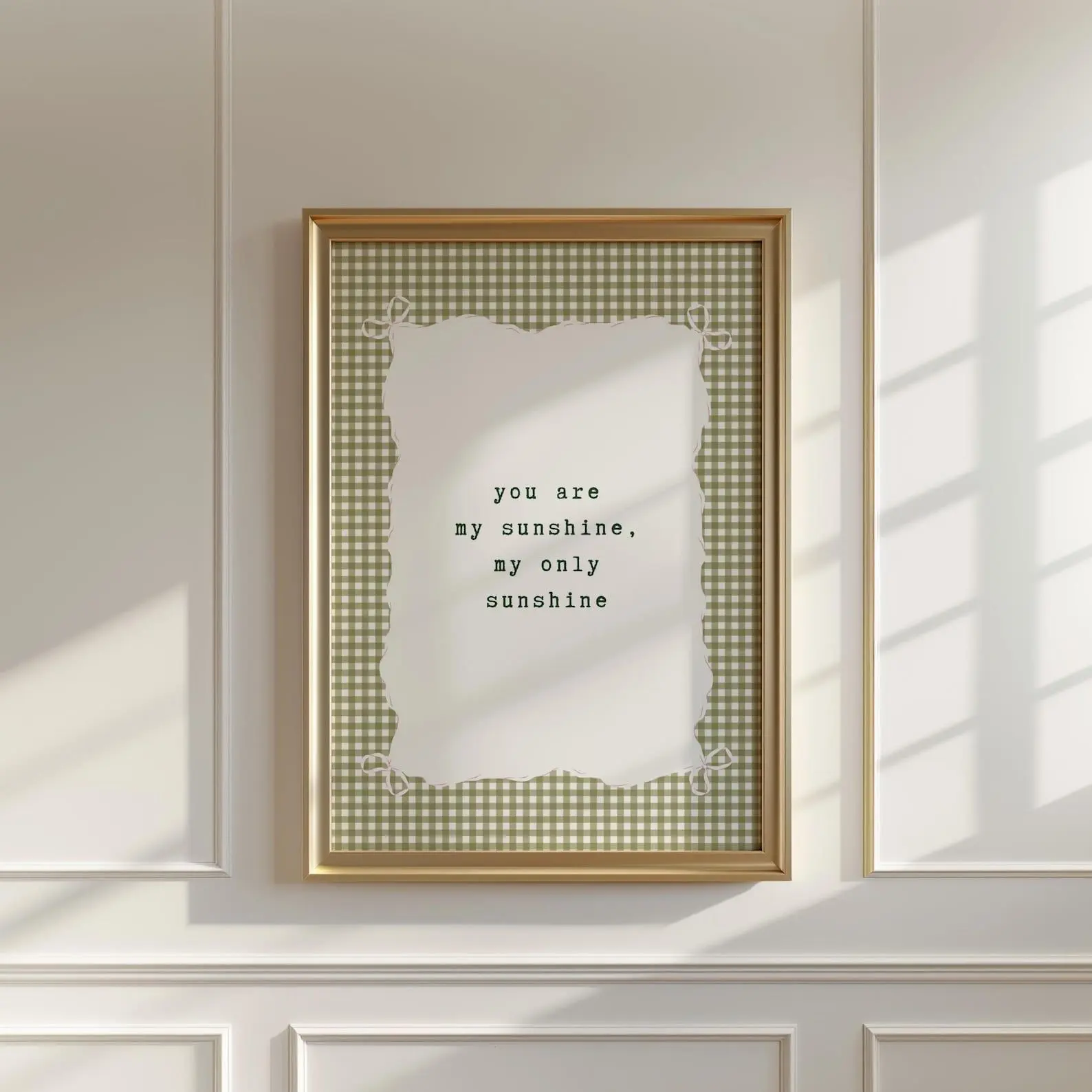 You Are My Sunshine Nursery Wall Art  Green Gingham Farm House Girl's Room Decor  Cottagecore Rhyme Kids Room  Neutral Bow Print