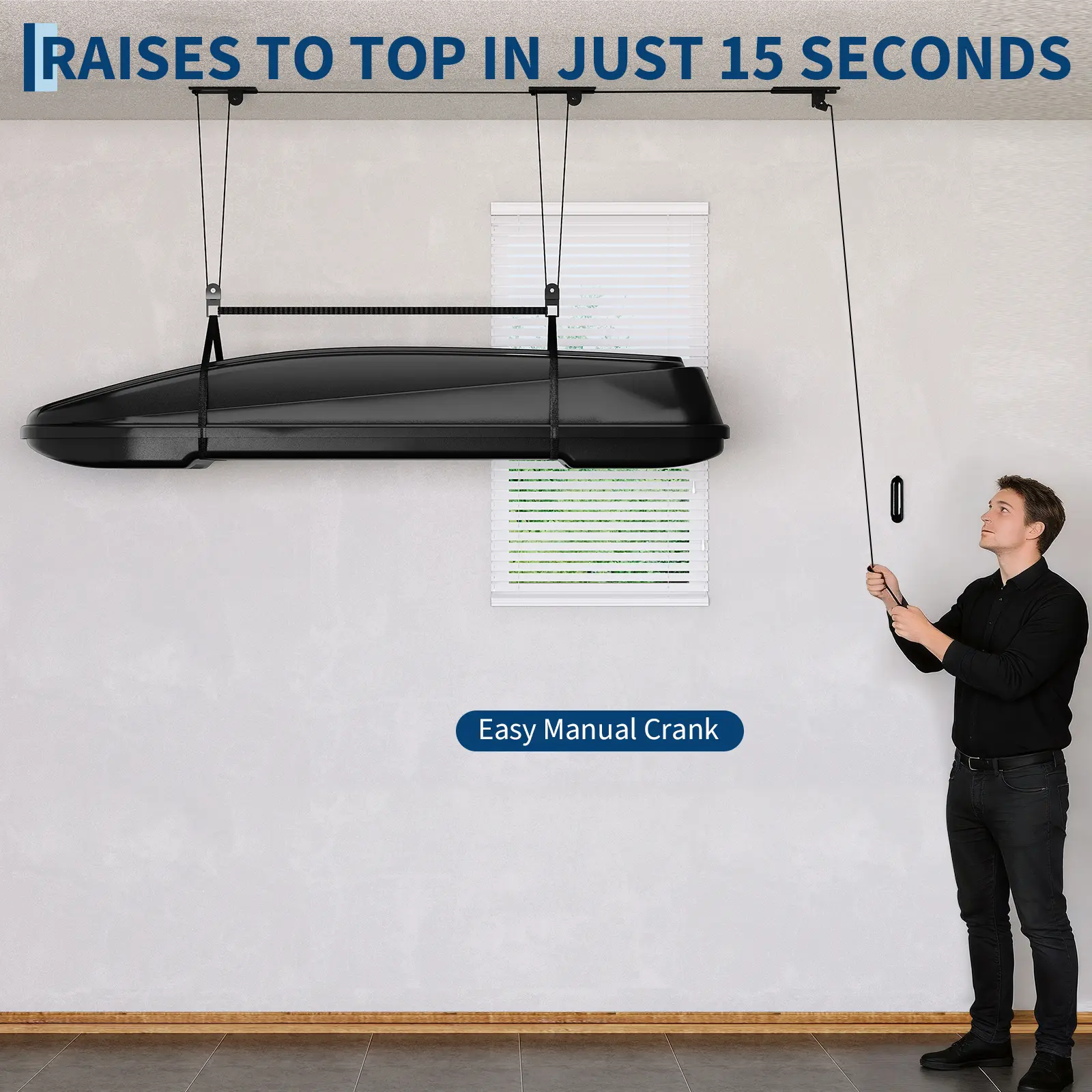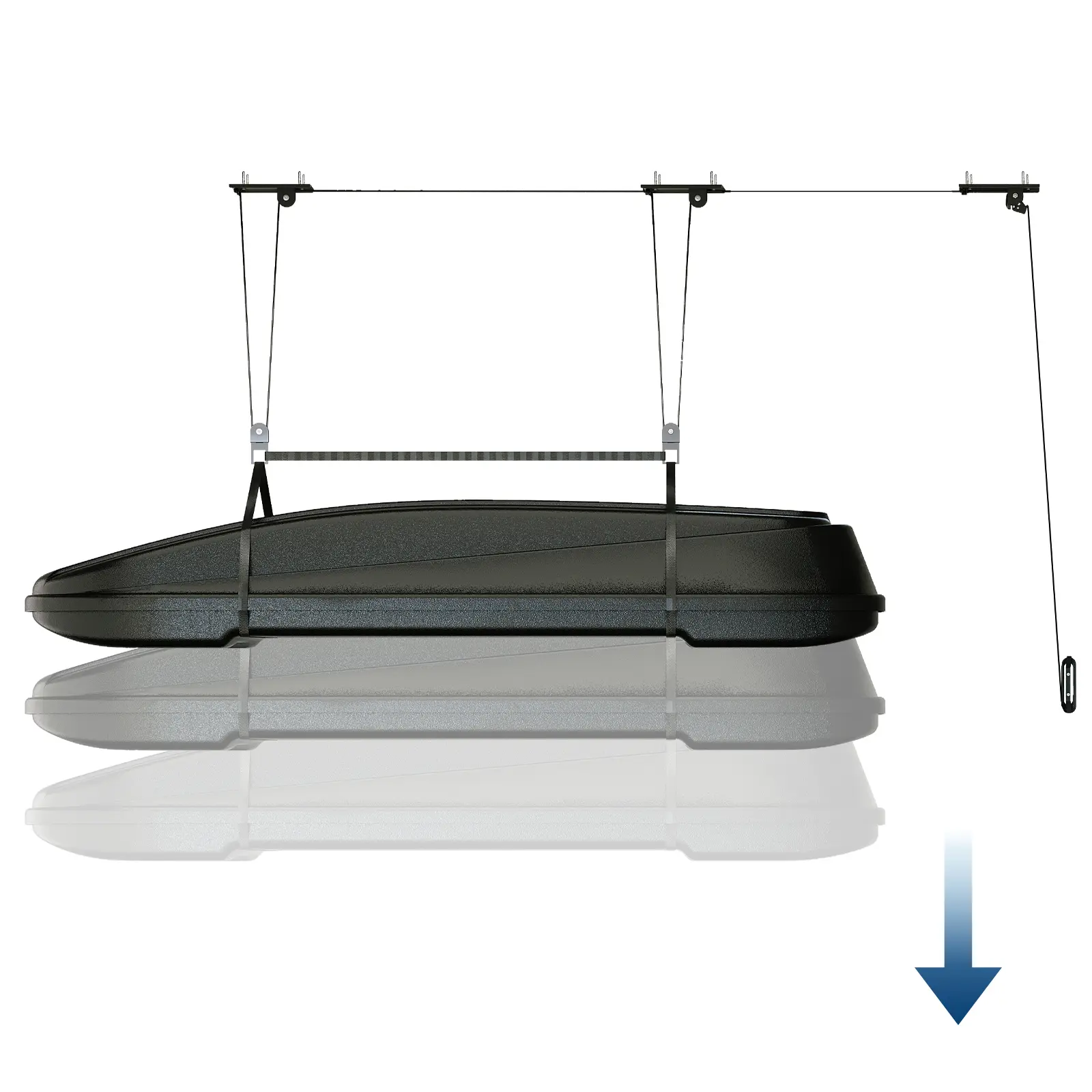 Maximize your garage space and keep your equipment organized with our Cargo Box Garage Pulley System. Designed for secure, overhead storage, this ceiling hoist system is perfect for rooftop cargo boxes, large storage bins, seasonal gear, and more. Built from robust black steel and high-strength ropes, it provides reliable lifting for everyday use and heavy-duty demands.