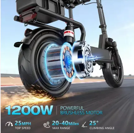 [Excellent Performance] The electric scooter for adults ispropelled by a 1200W peak motor. With strong power, it canclimb up to a 25° hill. This e scooter can reach a max speed of25 mph, whether it is commuting or leisure riding, allowingyou to easily travel between different places to meet yourneeds.
