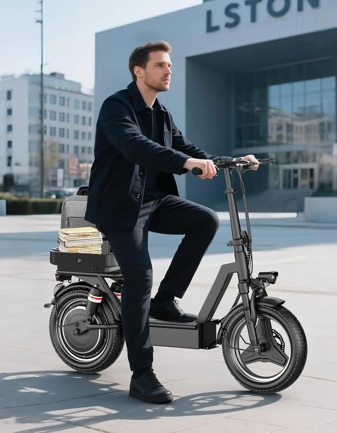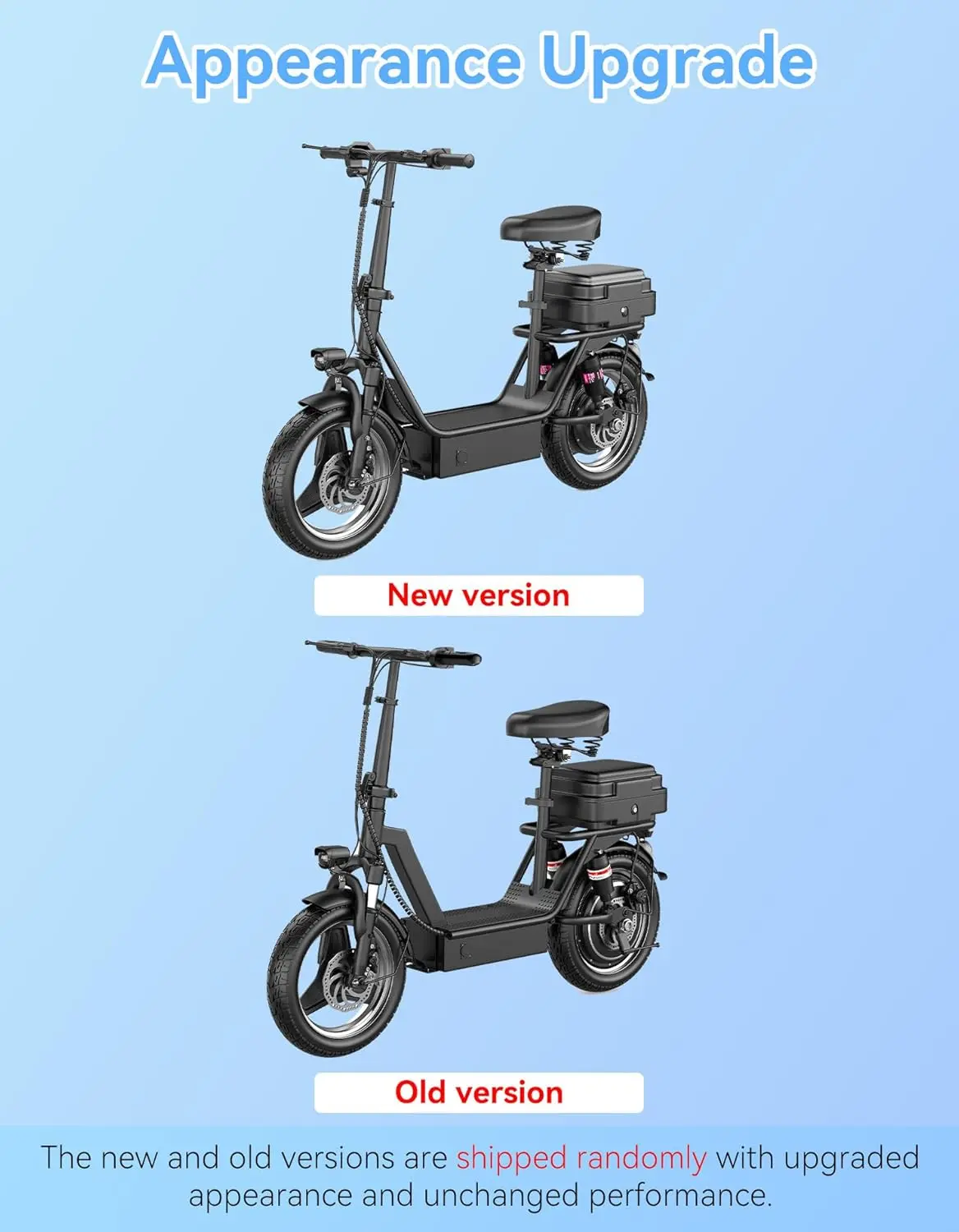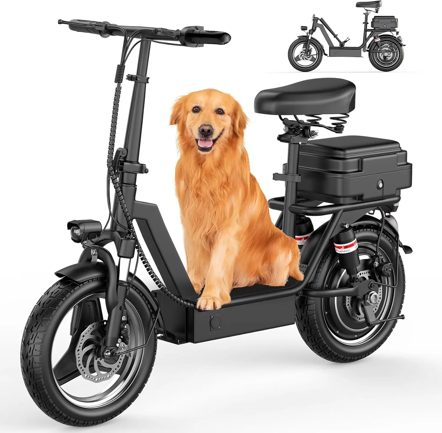 [Comfortable and Smooth Ride] The 14" largeoneumatic tire escooter provides excellent traction forsmooth riding on different terrains. This foldable electricscooter is equipped with front and rear suspensions, whichcan effectively absorb road shocks and bumps to minimizeriding fatigue. The adjustable shock-absorbing seat ensurescomfortable riding for people of different heights. The comprehensive shock-absorbing system allows riders to ridecomfortably for a long time.