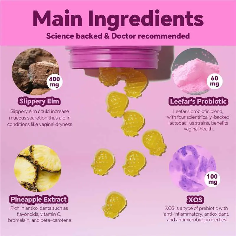 LEEFAR Her Probiotics Gummies offer a comprehensive solution for women's pH balance and dryness. This unique blend includes Slippery Elm, Prebiotics, and Lactobacillus Probiotic. Perfect for maintaining optimal health, these gummies are flavored with a delightful Hawaiian Pineapple taste.