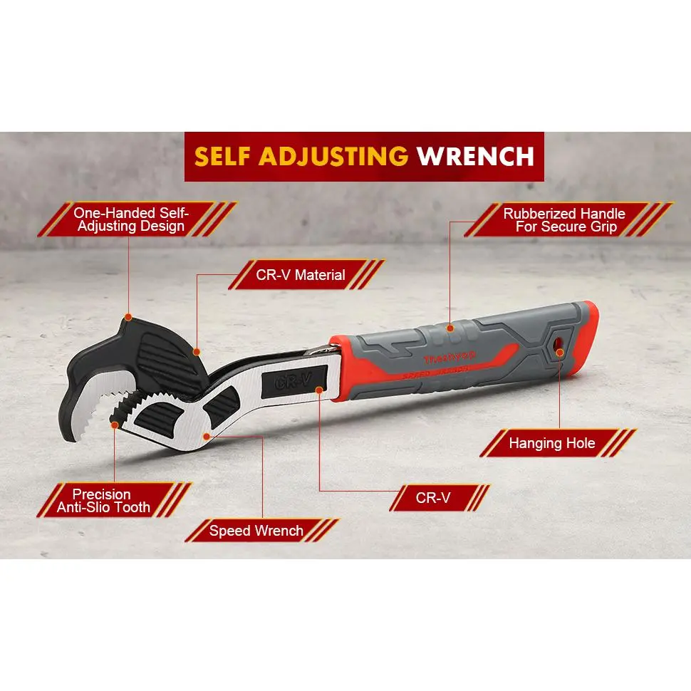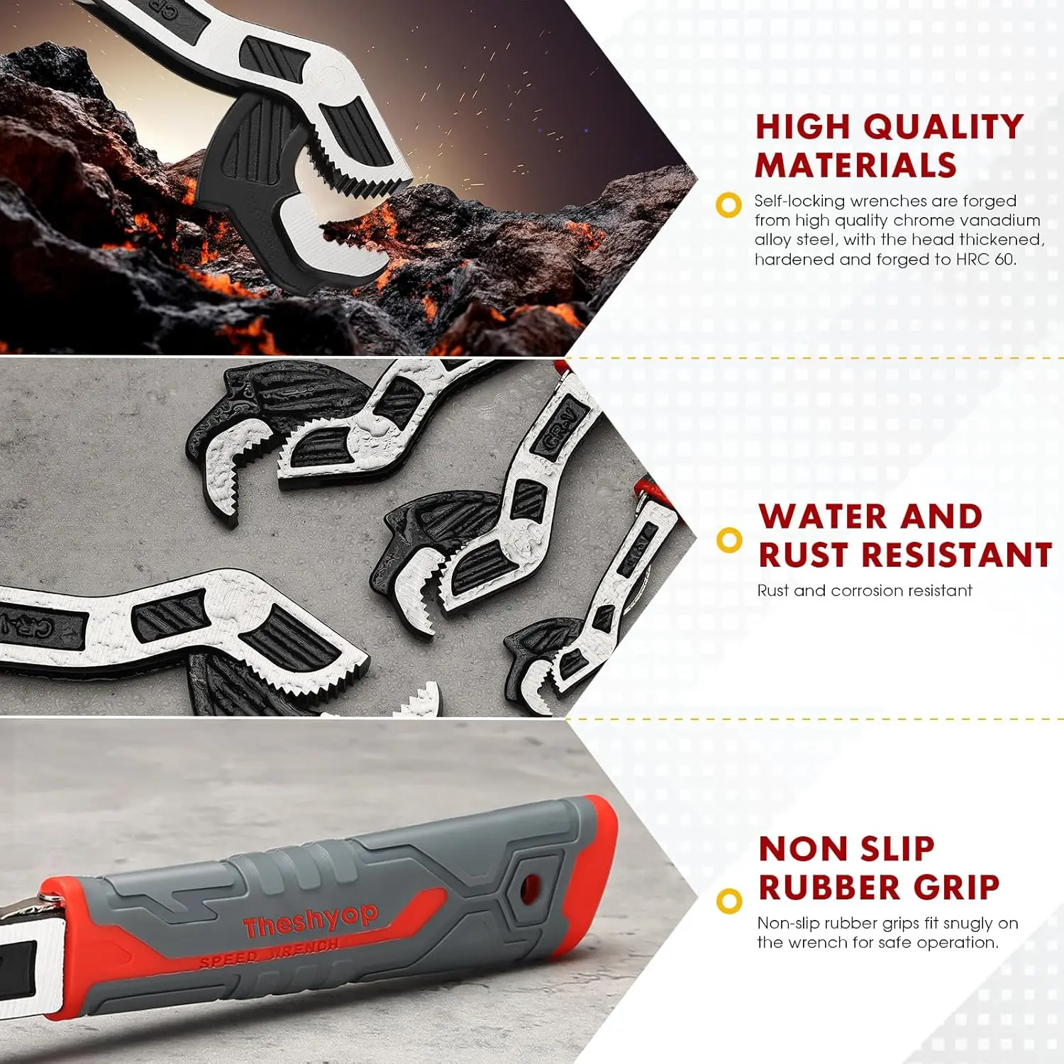 SELF LOCKING WRENCH TOOL: The Multifunctional Self Locking Wrench with built-in automatic locking spring, designed with self-locking function, convenient for one handed operation, simple and practical, greatly improving work efficiency.SUPER GRIP STRENGTH: The forged double threaded jaws of the self adjusting pipe wrench have good anti slip performance, which can be quickly adjusted during use and firmly grip the pipeline or nut, making it convenient to use and saving you time and energy.DURABLE AND STURDY: The multi functional self locking wrench is forged from high-quality chromium vanadium alloy steel, with a large opening and adjustable positions.The self locking wrench set is thickened, quenched and forged, and has a hardness of up to HRC 60.It is twisted, safe, stable, non slip, sturdy, durable, and has a long service life.SELF ADJUSTING WRENCH: Clamping range from 7-15 mm for 6 inches wrench, 9-25 mm for 8 inches wrench, 15-35 mm for 10 inches wrench, and 19-43 mm for 12 inches wrench, adjustable pipe wrench widely use on pipe, screw, nut and so on.MULTIFUNCTION HANDLE: The self adjusting wrench have an ergonomic handle that keeps the user's wrist in a comfortable position to reduce pressure.