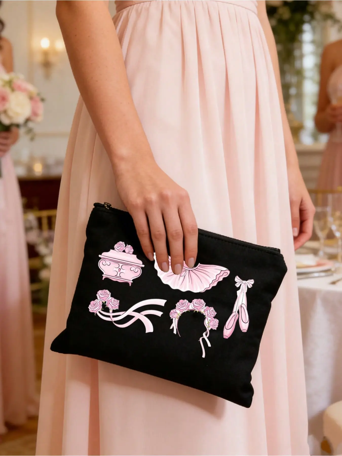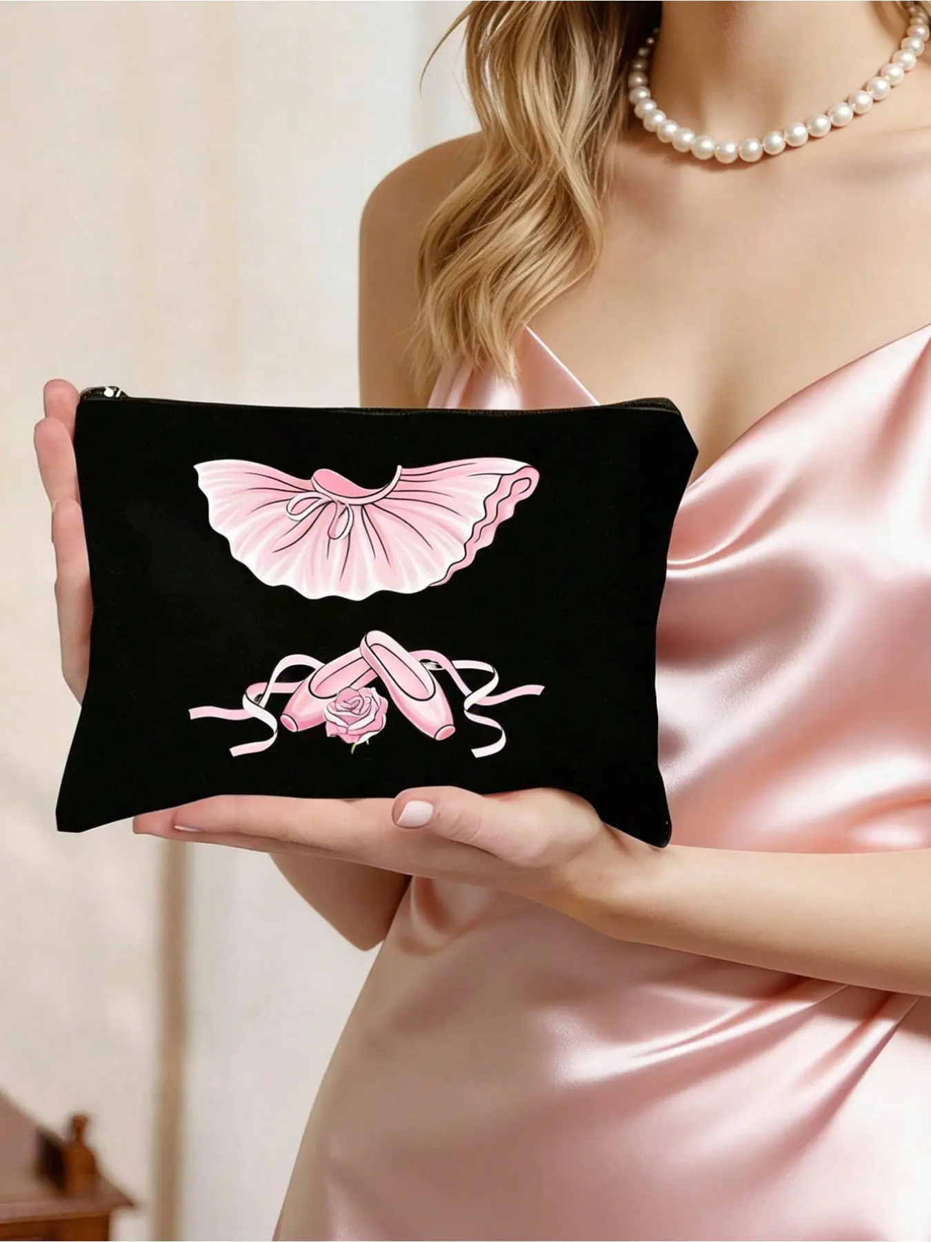 Ballet Pattern Women's Black Makeup Storage Bag, Handbag, Zippered Canvas Bag, Cute Retro Ballet Skirt, Dance Shoes, Rose Element, Bow Element, Vacation Bag, Large Capacity Storage Bag,