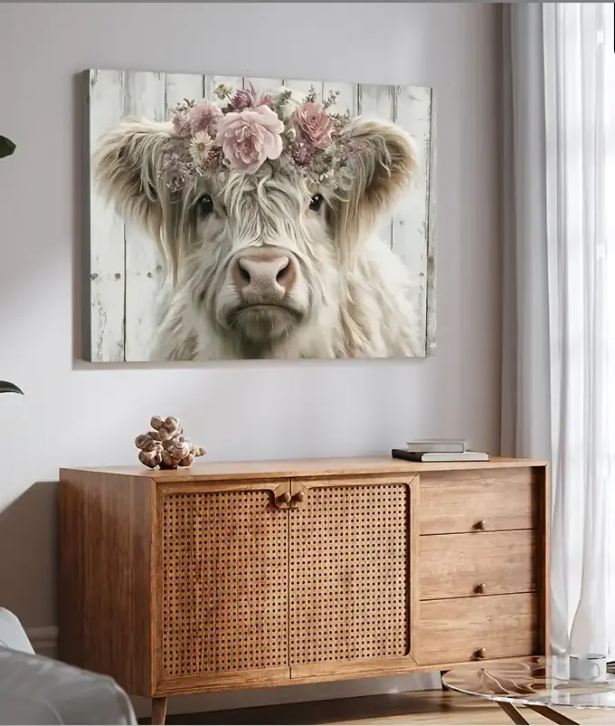 [Sale off up to 65%][Free Ship][No Frame] Highland Cow with Floral Crown Poster Wall Art - Rustic Nordic Farmhouse Wood Poster, Scottish Cow for Living Room