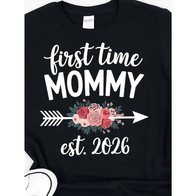 Women's First Time Mommy Est. 2026 Pregnancy Announcement T-Shirt - 100% Cotton Funny Mom-to-Be Gift with Floral & Footprint Design, Casual Round Neck Tee for Maternity Photos & Casual Attire, All-Season Comfort Fit, double Vintage Metalcore Graphic