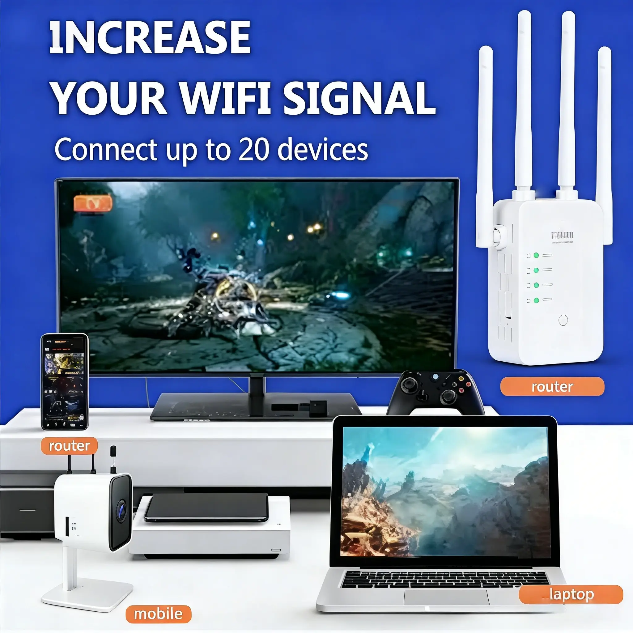 Coverage up to 10,000 sq. ft! Eliminate dead zones with 4 powerful antennas. This extender provides strong and stable WiFi across your home or office. It's perfect for large spaces, ensuring every corner is connected.