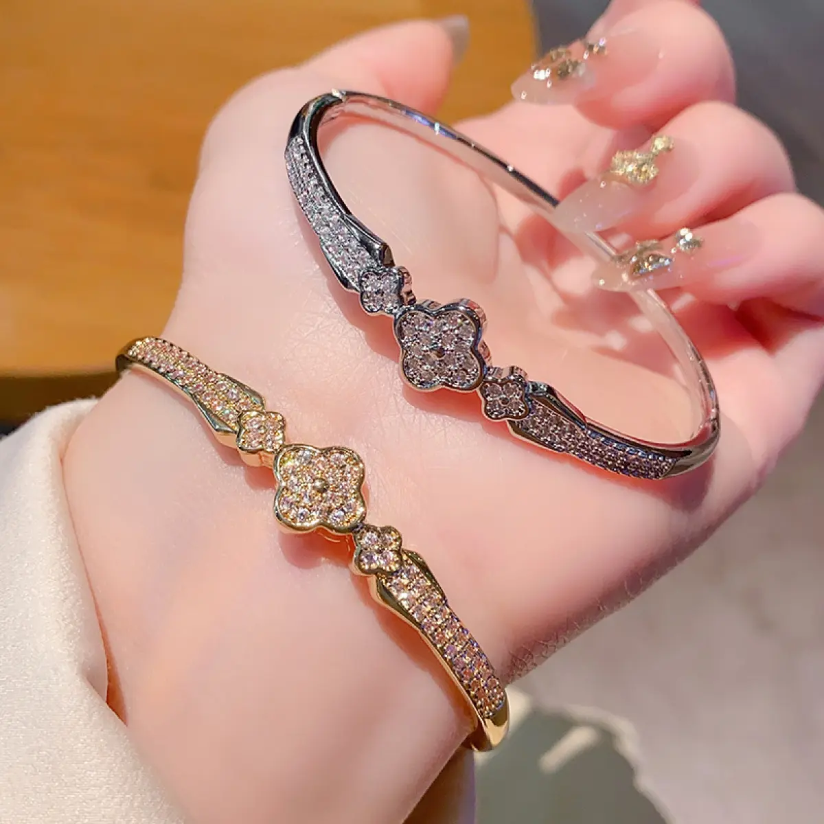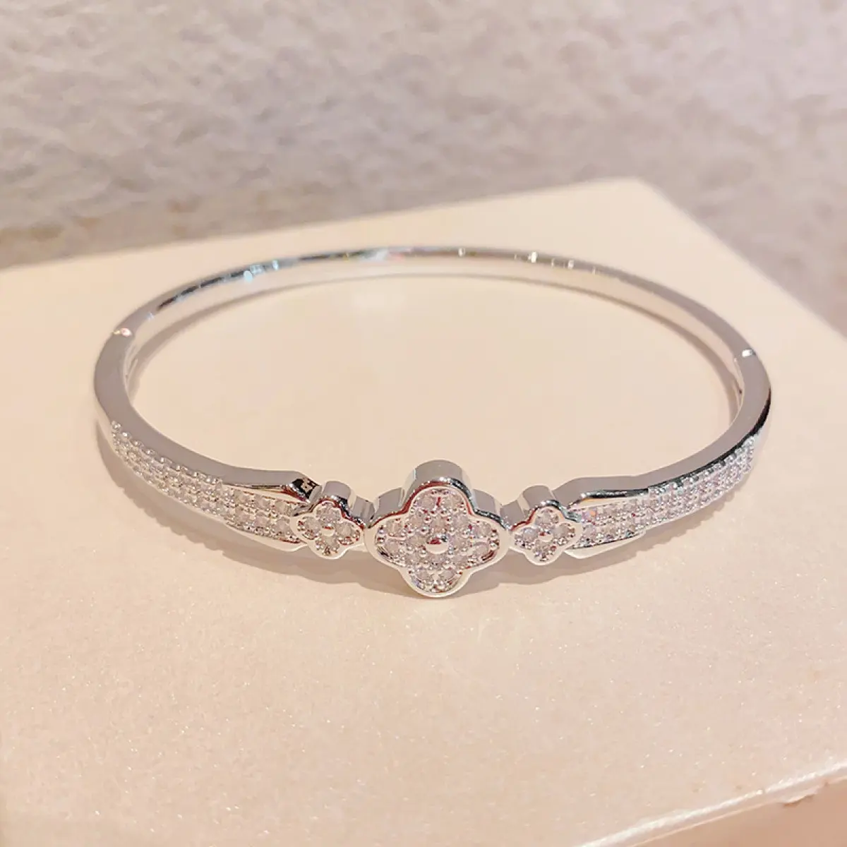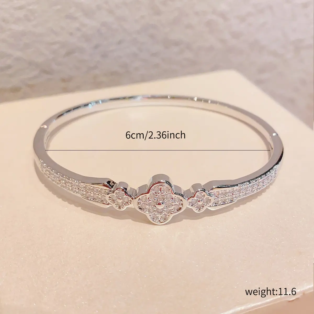 Featuring a sleek, polished metal bangle frame with smooth, rounded edges, this piece is centered around a stunning four-leaf clover motif — a symbol of luck and femininity — adorned with a dense array of meticulously placed, faceted sparkling accents. The continuous pavé-style detailing along the band delivers a brilliant, light-catching sparkle that elevates any look, while the balanced design ensures a comfortable, weightless fit on the wrist.