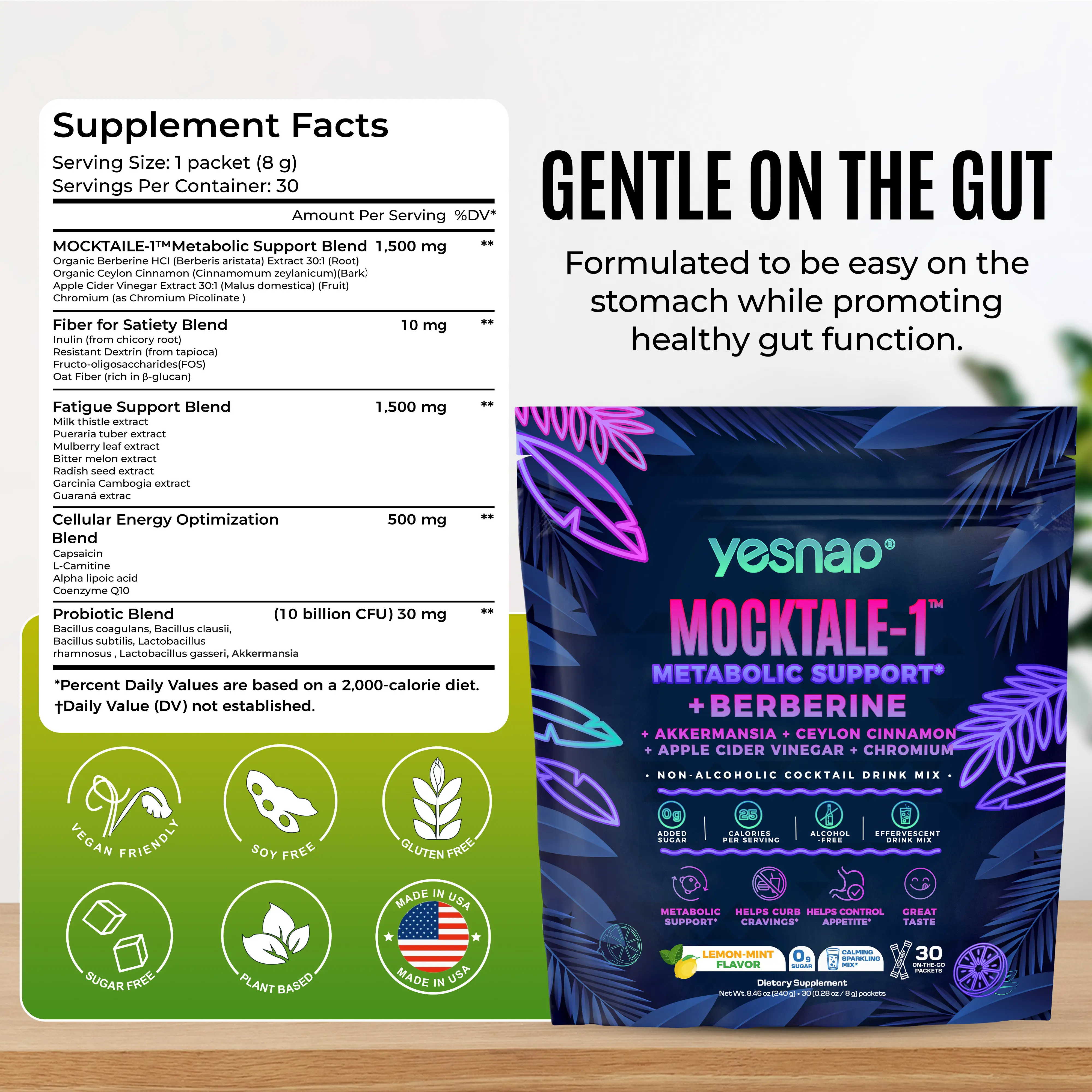 Yesnap MOCKTALE-1 Metabolic Support with Berberine & Akkermansia, Chormium, Cylon Cinamon, Apple Cider Vinegar - 30 Packets Lemon Mint Flavor Non-Alcoholic Cocktail | Powdered Supplement Drink Mix