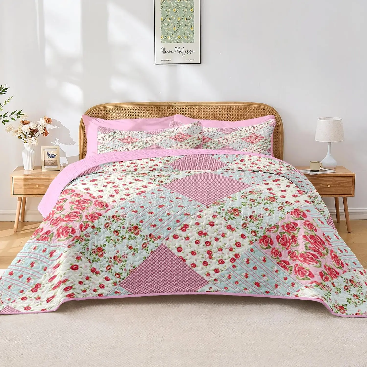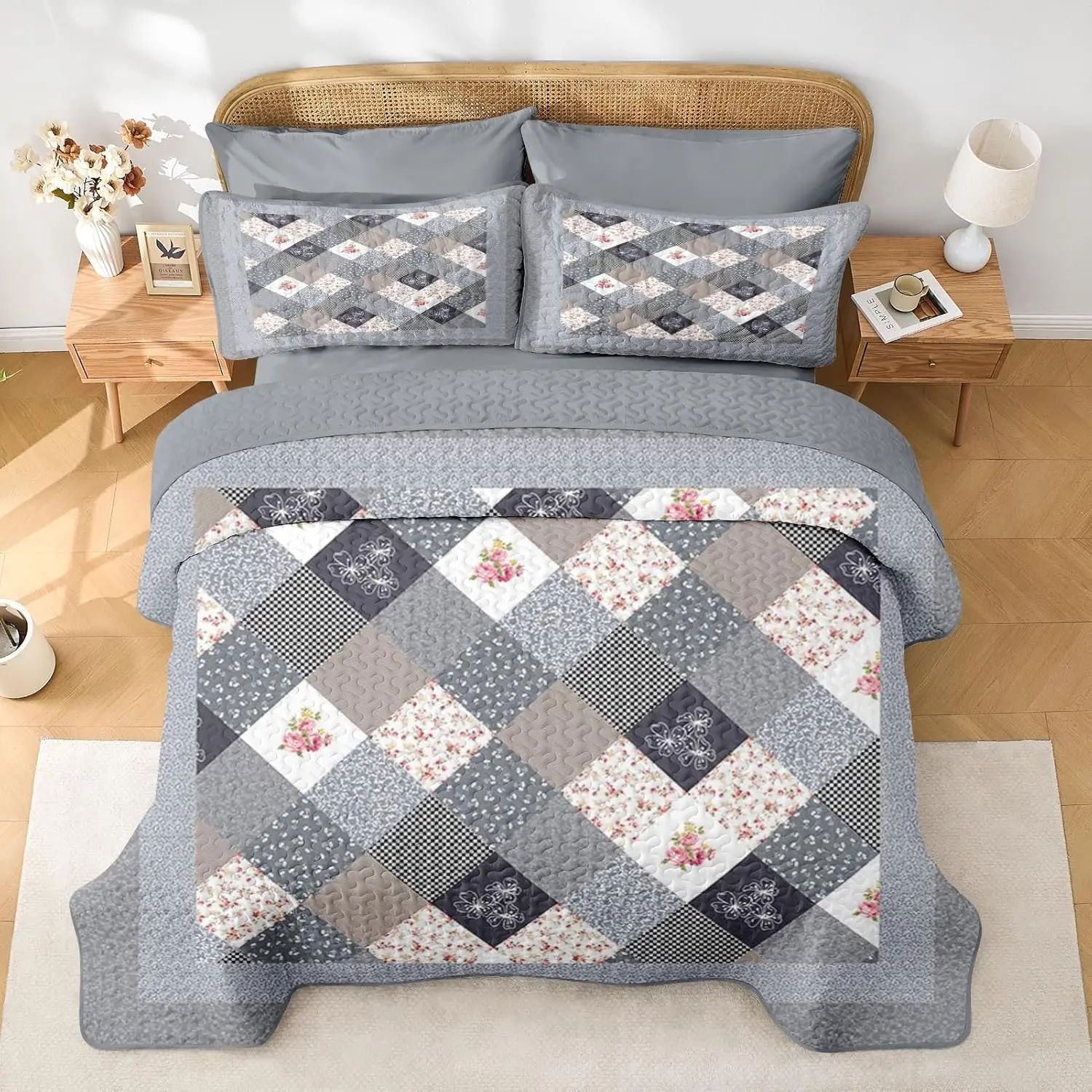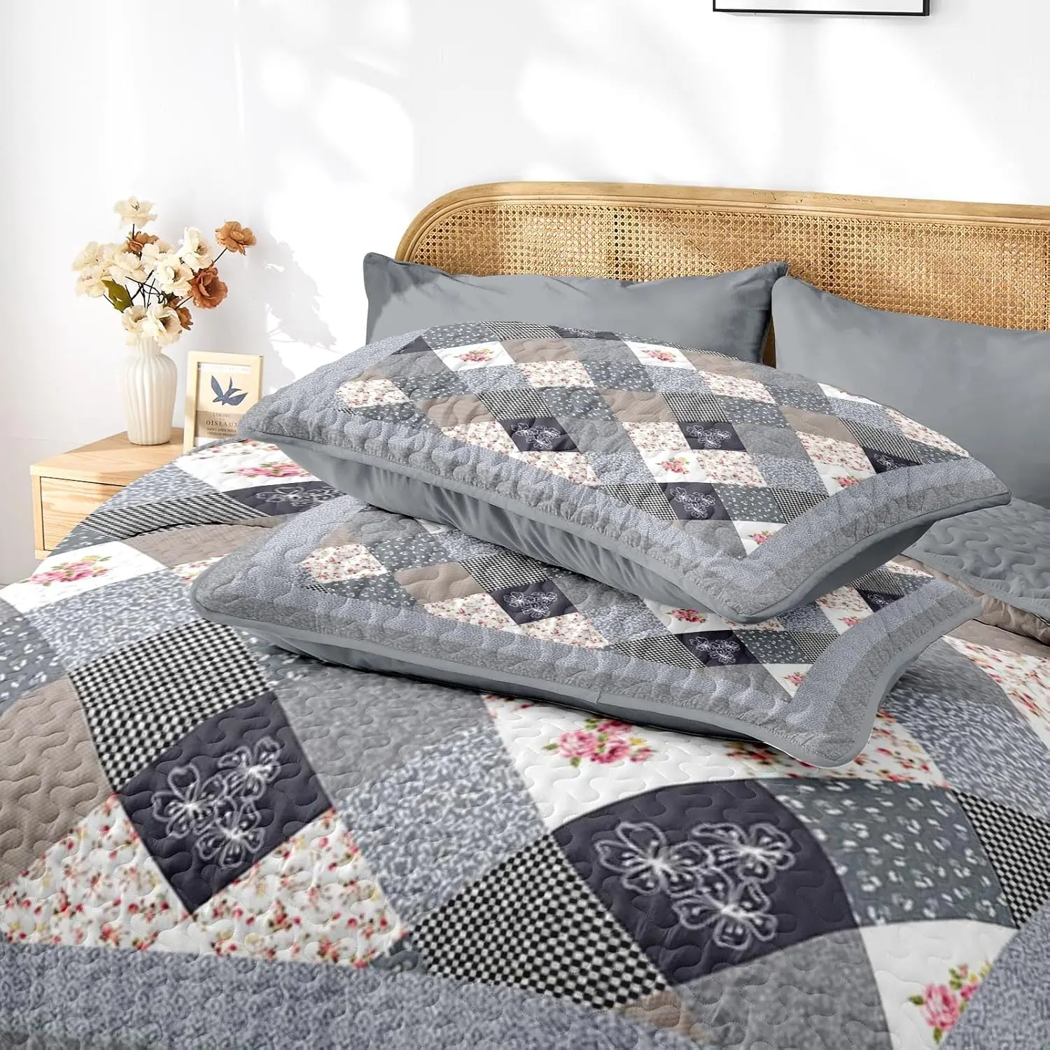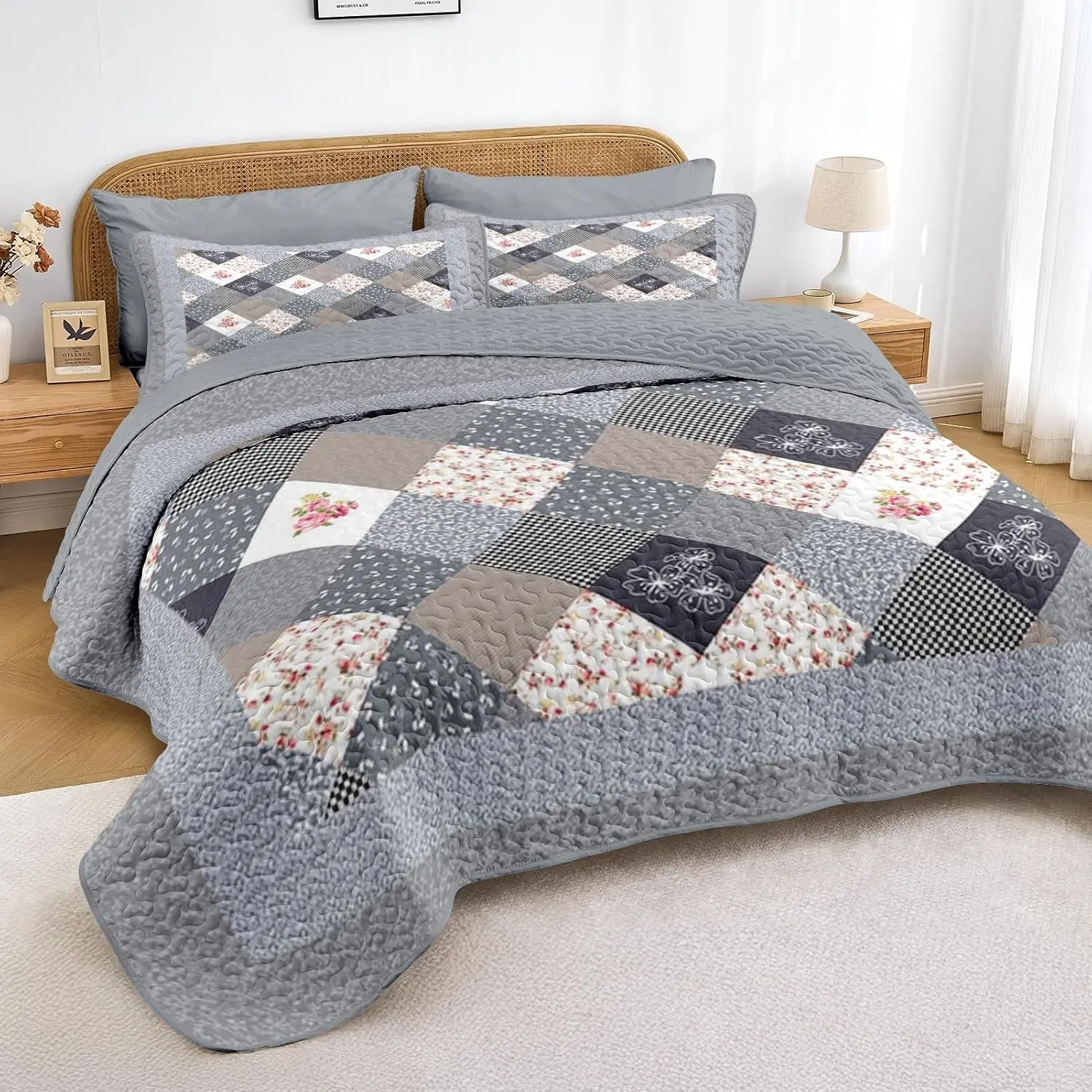 Patchwork Set Queen Size, Floral Rustic 3 Pcs Soft Bed Cover Bedding Set, Boho Flowers Lightweight Bedspread Coverlet with 2 Pillow Shams for All Season