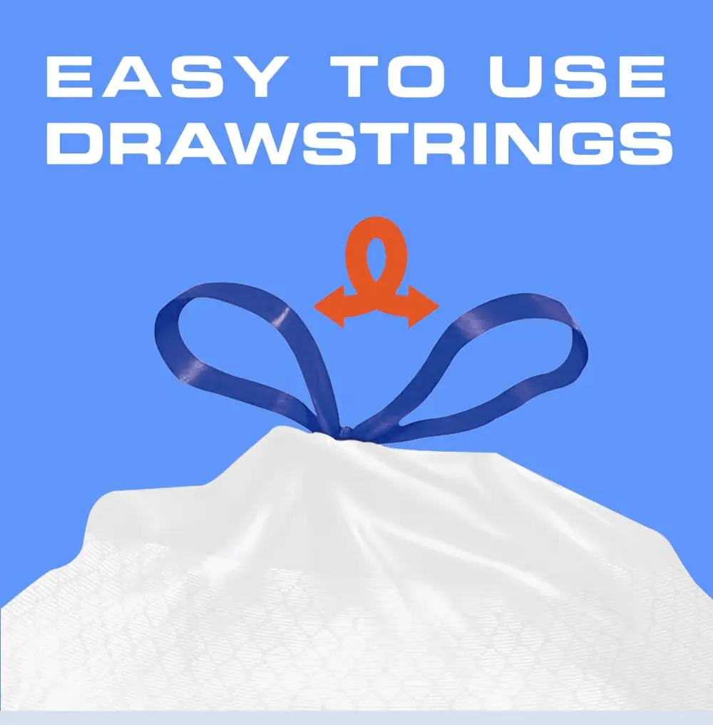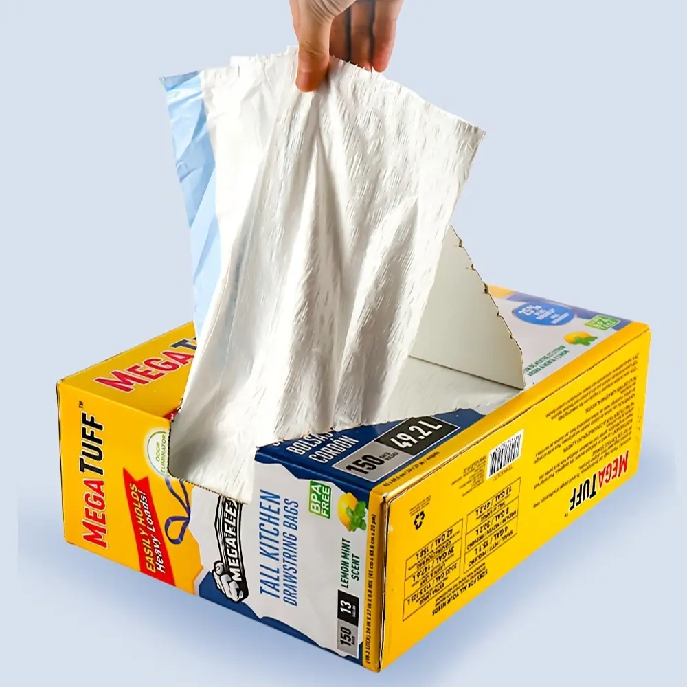 Boxed Disposable Non Tear Garbage Bag Puncture Tear Resistant Trash Bags, 50 Bags/Roll 13 Gallon Capacity, ODOR ELIMINATORTECHNOLOGY Kitchen Drawstring Garbage Bags Fresh Clean Scent with Lemon Mint Scent, EASY to USEDRAWSTRINGS MORE DURABLE