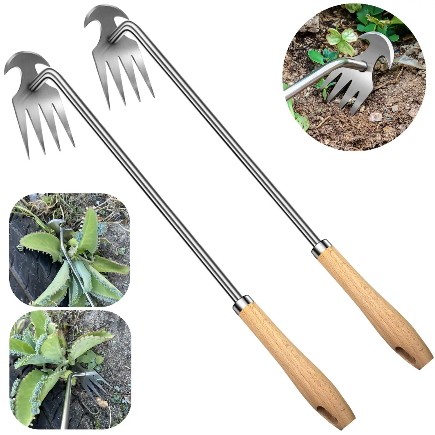 ·Engineered for strength and longevity, our stainless steel weeder features four high-hardness tines that resist rust, bending, and breaking—ensuring years of reliable use. The ergonomic wooden handle provides a secure, non-slip grip, making weeding and soil loosening effortless