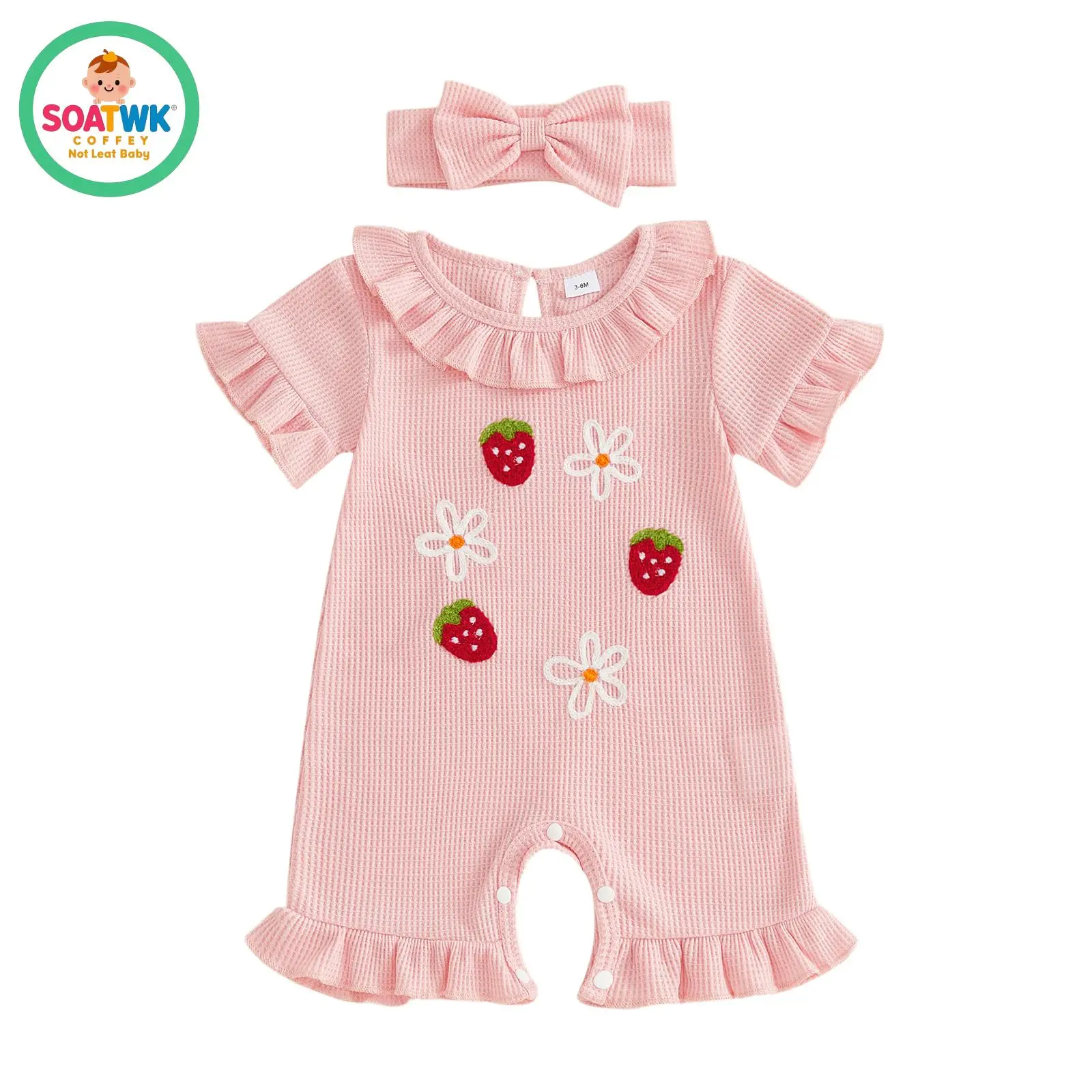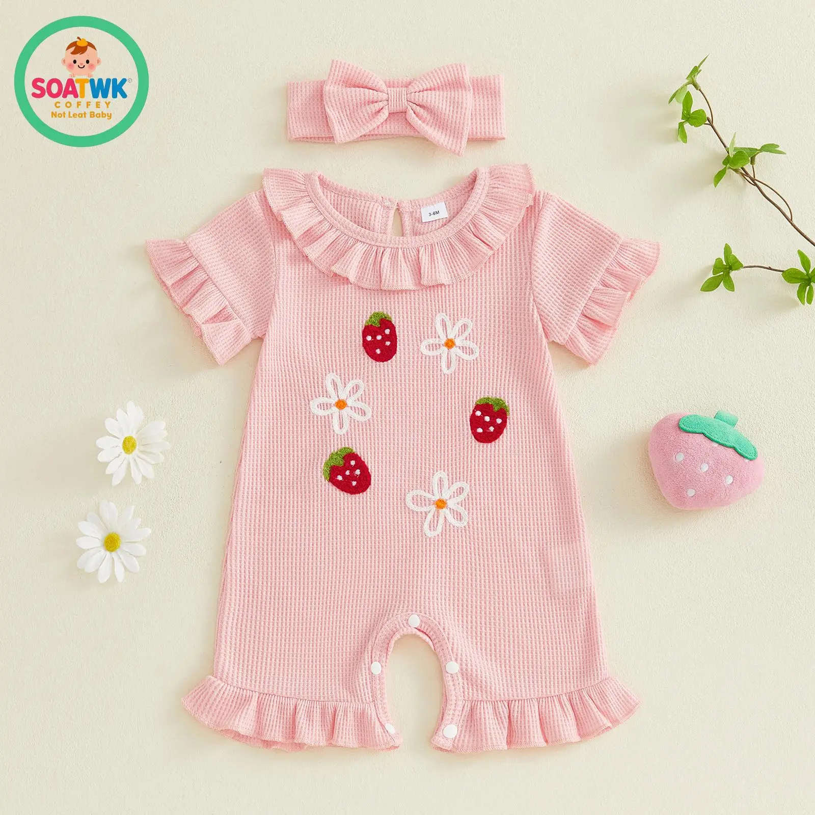 Baby Girl Summer Romper Strawberry Floral Embroidery Ruffles Short Sleeve Jumpsuit with Cute Headband Set