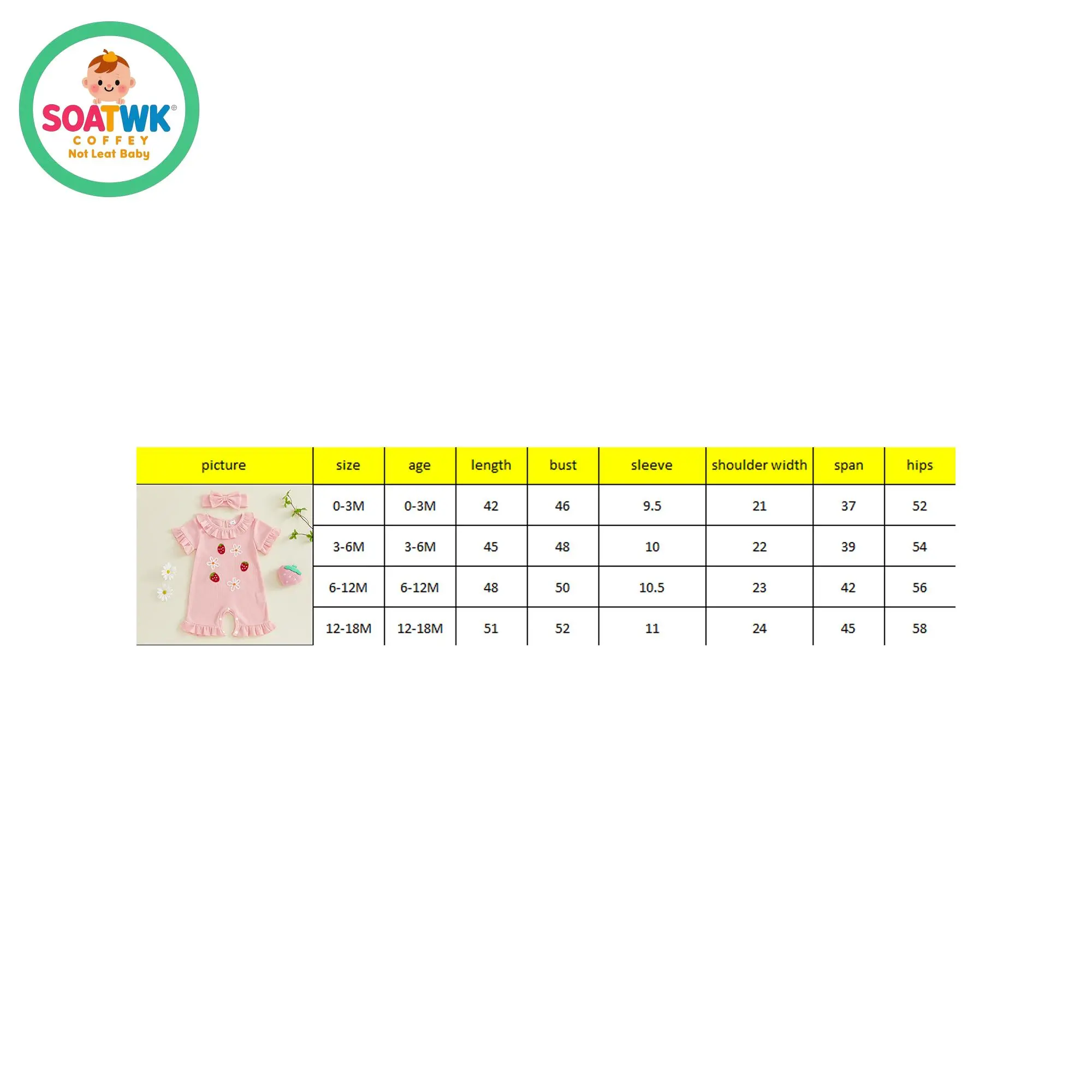3-6M Length: 45 Bust: 48 Sleeve: 10 Shoulder: 22 Hip: 54 Advised Age: 3-6 Months