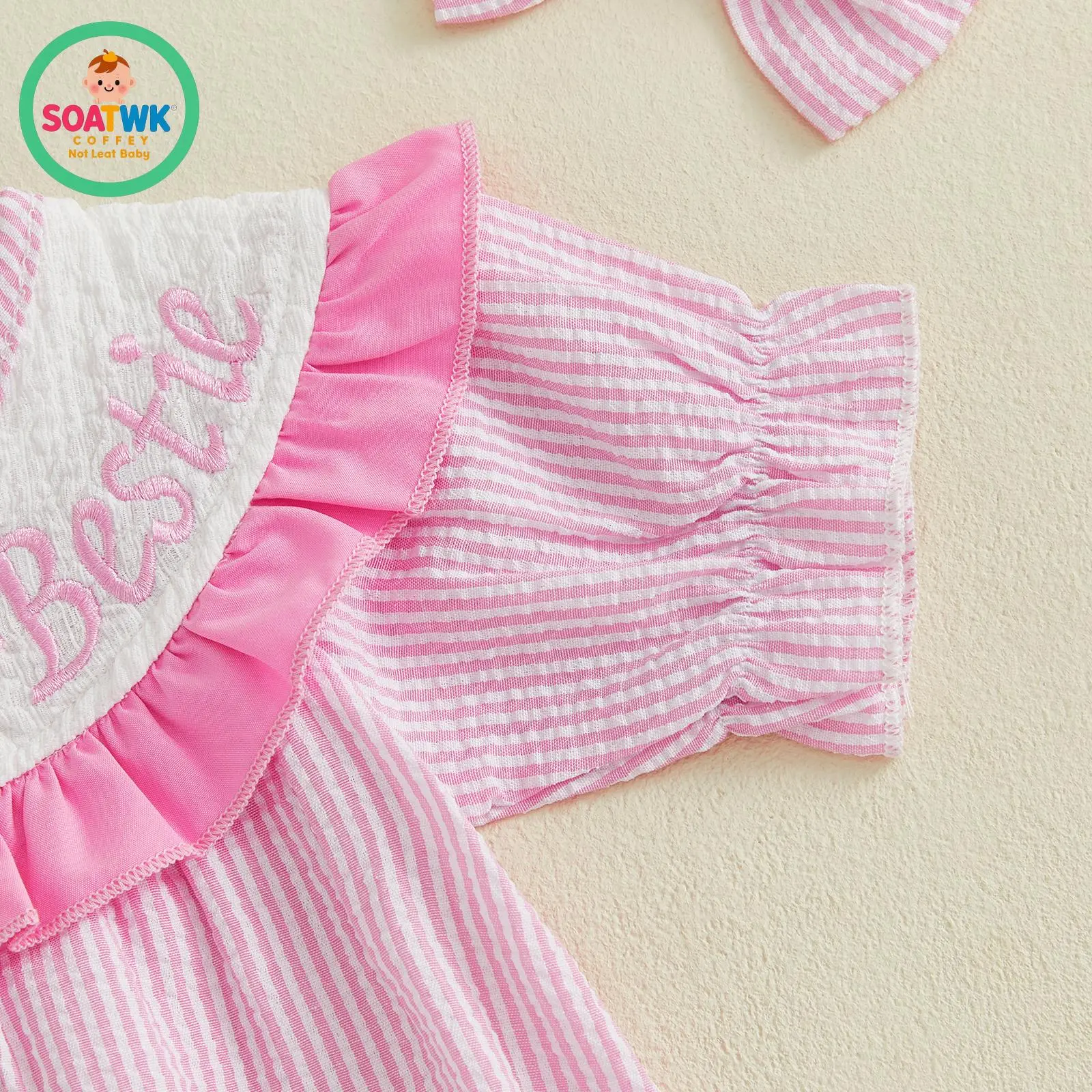 Baby Girl Summer Outfit Striped Letter Embroidered Puff Sleeve Bubble Romper and Bow Headband 2 Piece Set