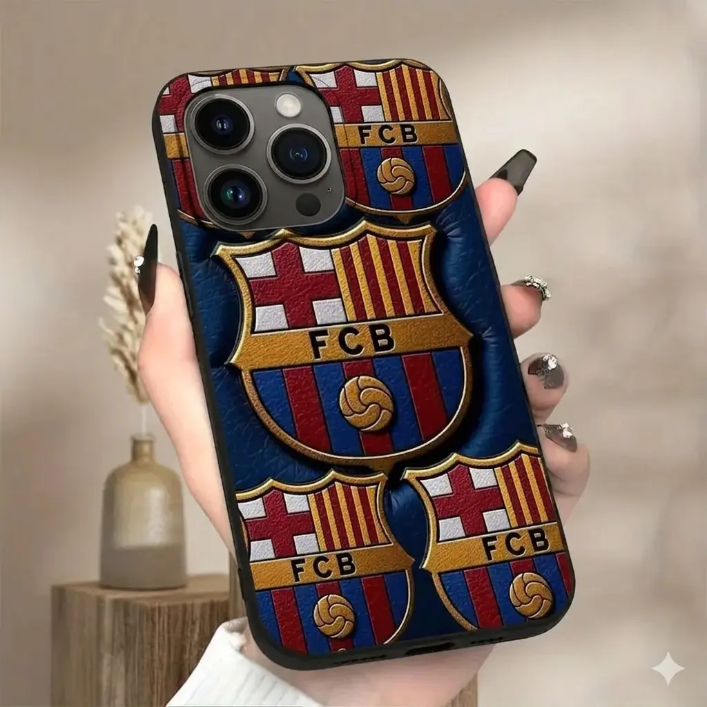 FC Barcelona Luxury 3D Embossed Leather Texture Phone Case for iPhone 15 14 13 Pro Max FCB Soccer Football Fan Crest Shield Shockproof Padded Cover Protective Stylish Gift for Him Men Fans