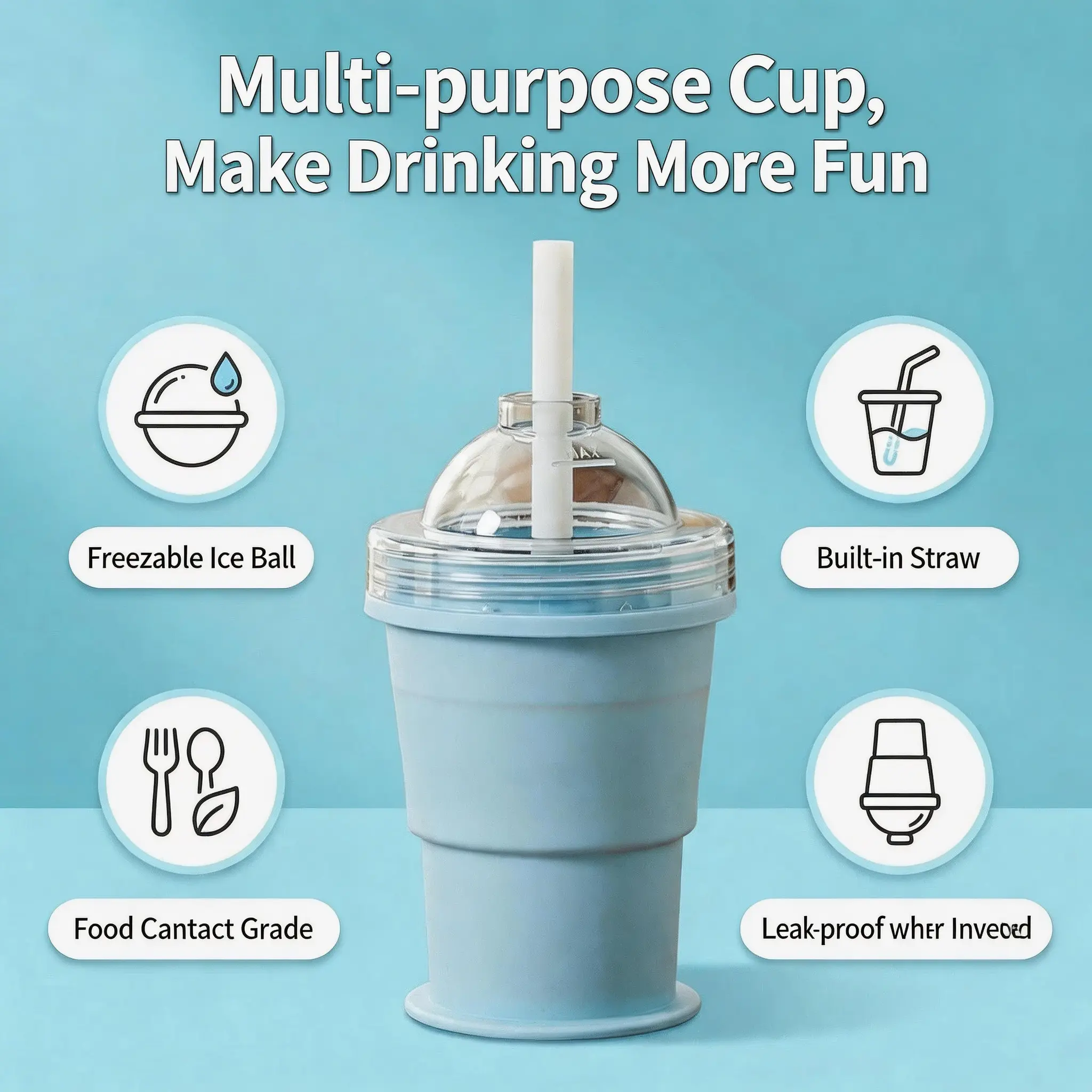 Portable Foldable Ice Ball Cup with Straw – Silicone, Food-Grade Ice Maker Mold, Summer On-the-Go Tumbler
