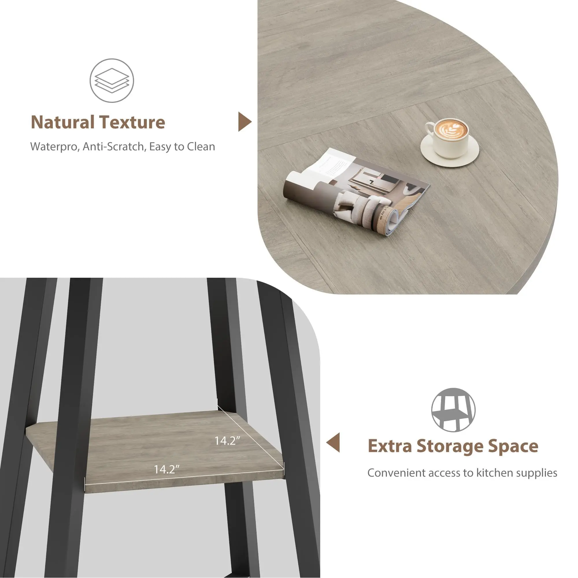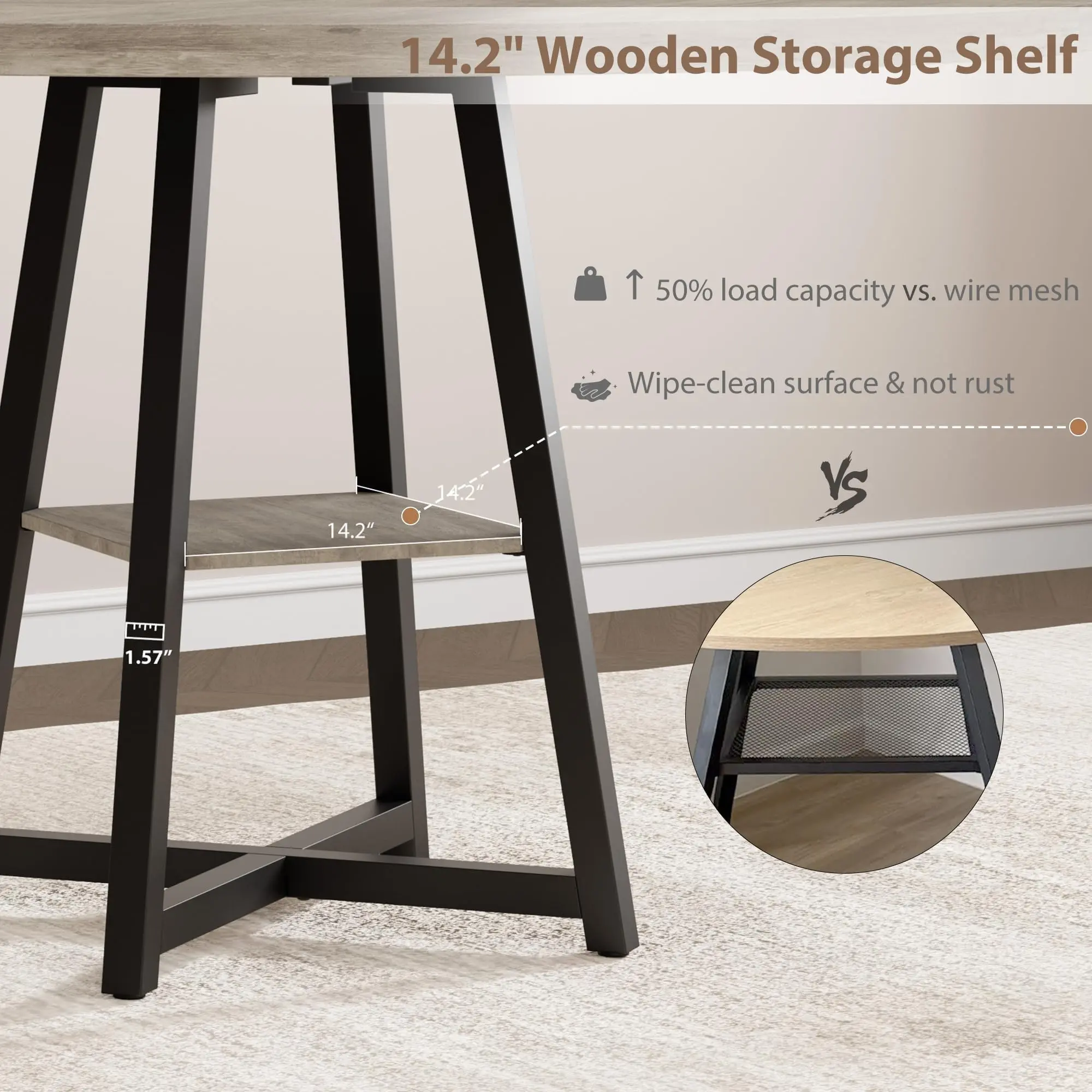 · 2. Reinforced Tabletop = Less Wobble, Tighter FitThe wood-grain top is built from four boards secured with reinforced metal brackets, helping reduce gaps and keeping your dining room table stable through everyday use.