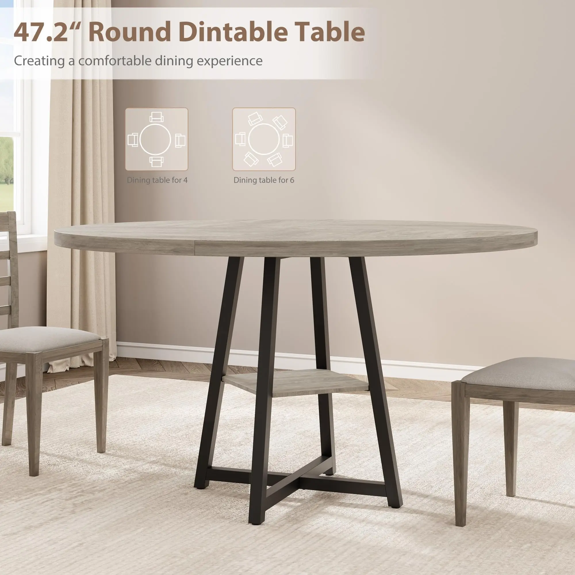 · 1. Seats 4–6 Comfortably (47'' Round Dining Table)This 47 inch round dining table seats 4 to 6 people with an easy-reach circular layout—ideal as a kitchen table for daily meals, brunch, and game nights.