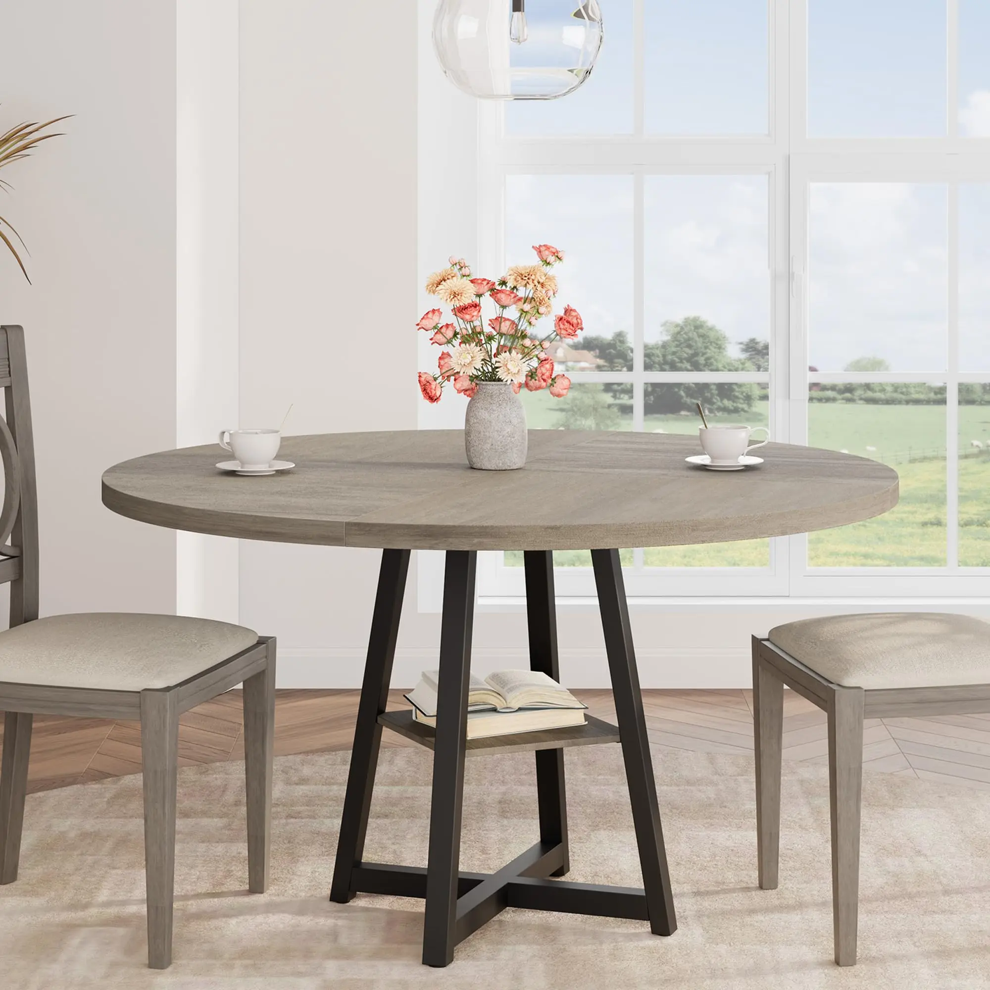 · 3. Pedestal Base with Storage Shelf (Space-Saving)A practical storage shelf at the base holds placemats, napkins, baskets, or décor—keeping the surface clear and making this circle kitchen table a smart choice for apartments and breakfast nooks.