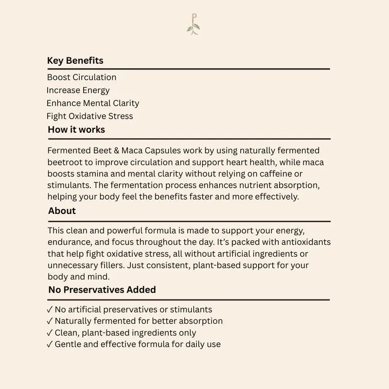 This product is a straightforward choice for anyone looking to enhance their diet with fermented beet and maca. No additional features or claims are made. Enjoy the simplicity and benefits of this supplement.