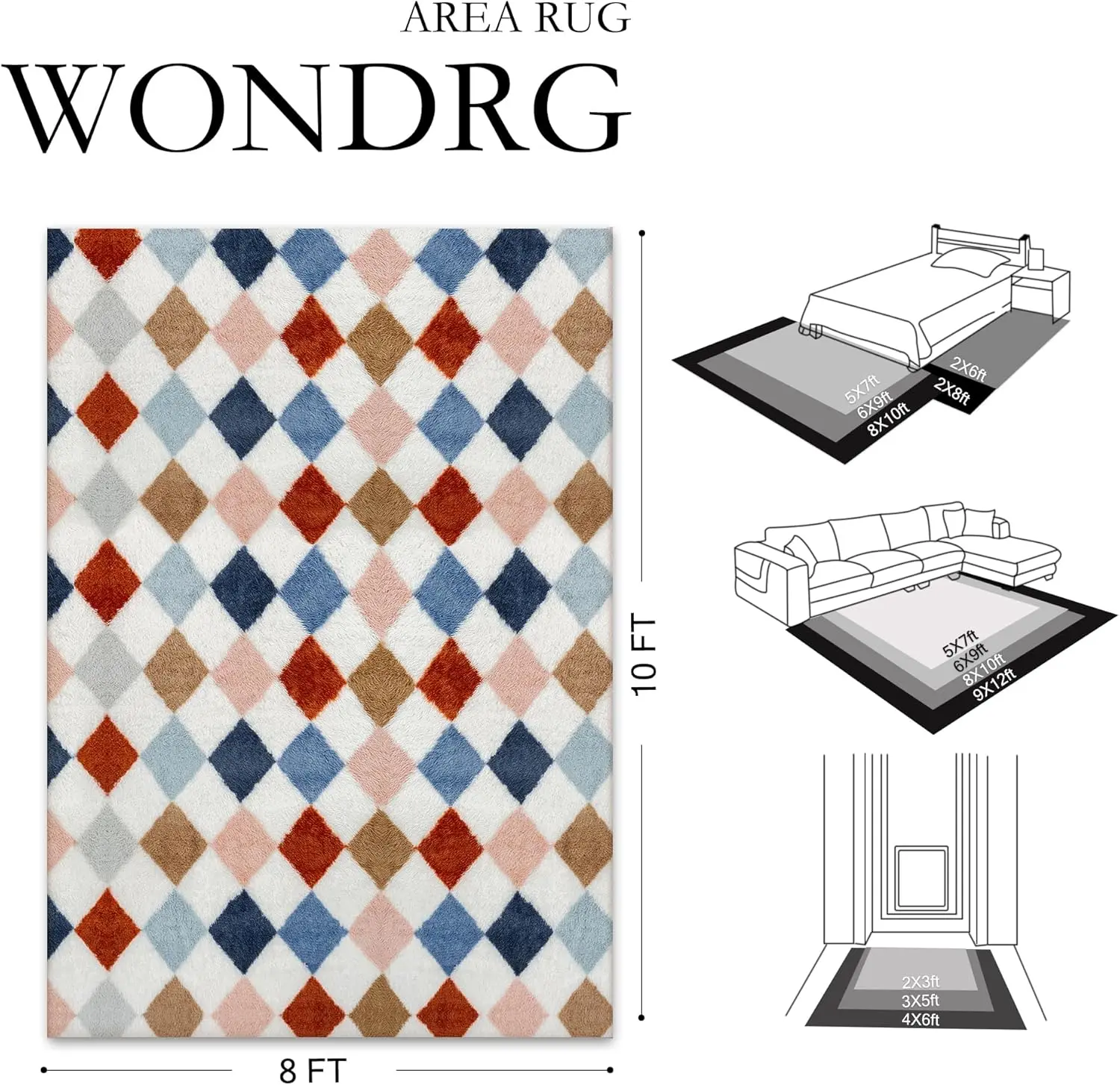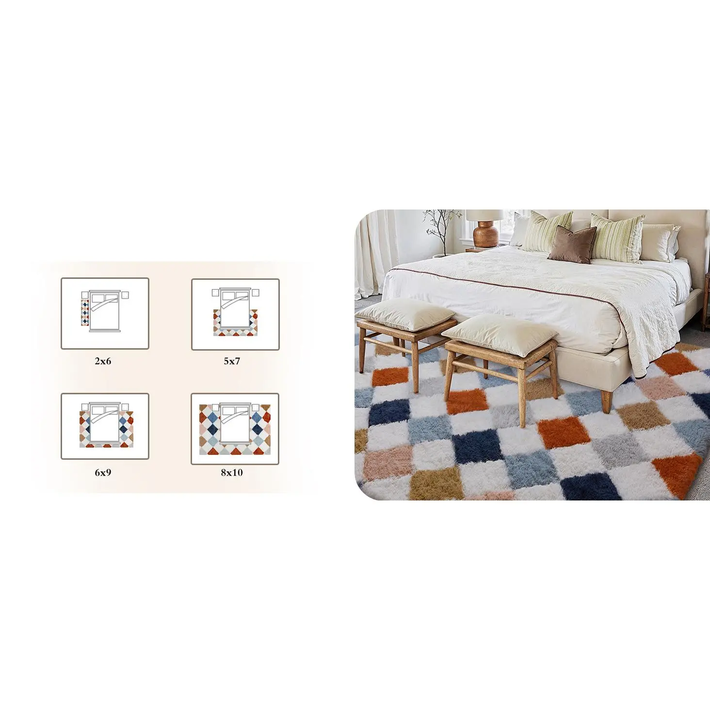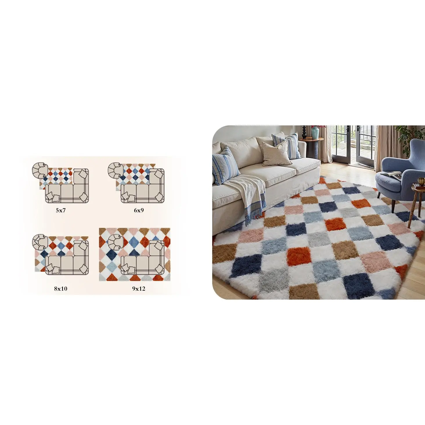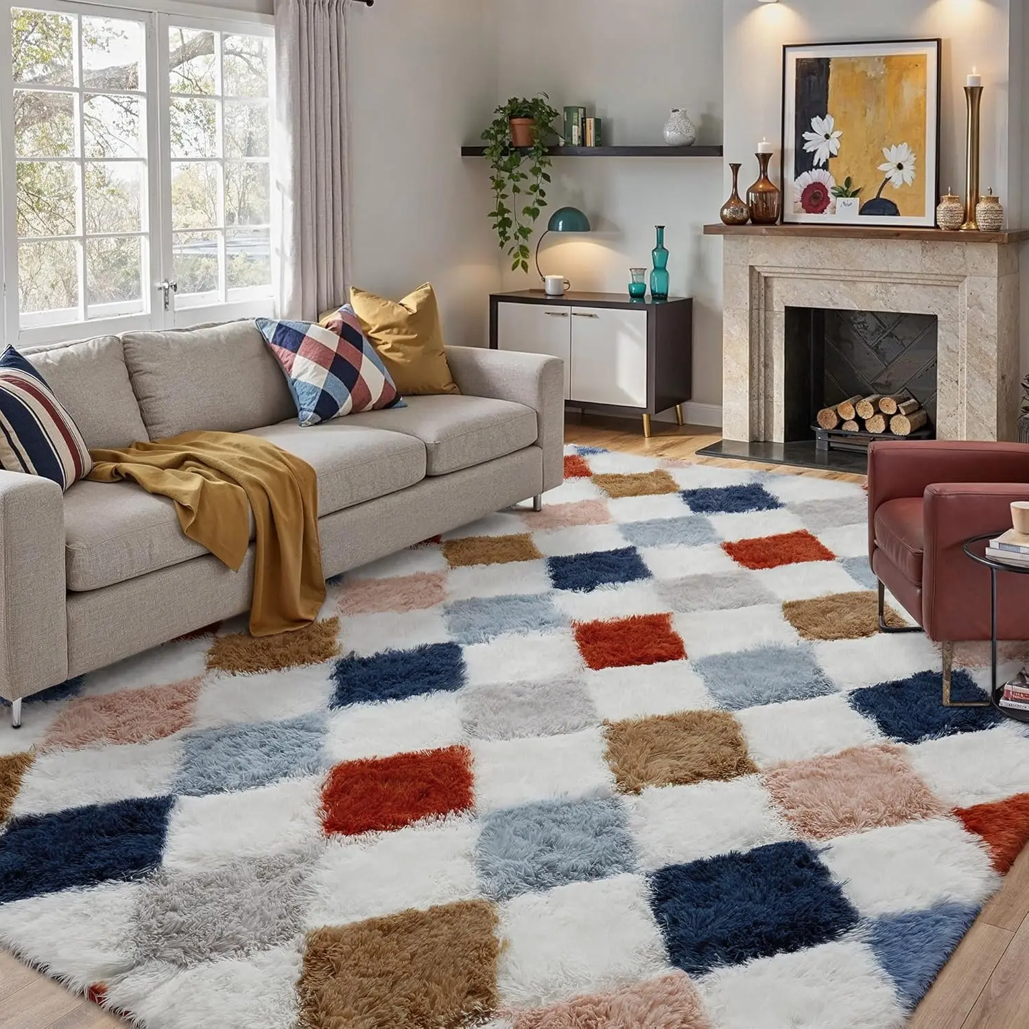 Modern Checkered Rug: This checkered plush rug features a stylish diamond pattern that blends contemporary aesthetics with cozy comfort.Its neutral tones and geometric style elevate your space, making it a chic addition to living rooms, bedrooms, hallway, office or aesthetic home decor.Soft Fluffy High Pile Rug: Crafted with thick long microfiber shag and a sponge middle layer, this soft fluffy rug delivers a cloud-like feel underfoot.Whether you’re lounging barefoot or creating a soft reading area, it offers unbeatable comfort and warmth.Secure Non-Slip Backing and Material: The shaggy checkered rug is made from skin-friendly, non-shedding fibers that hold color after wash.The thick felt backing features multiple anti-slip dots to keep it steady on floors.Versatile for Home Decor: From next to the sofa in living room to beside the bed or under table, this shaggy area rug fits effortlessly into any space.Its soft texture and cozy feel make it ideal for aesthetic home decor.Easy Care Carpet: Due to vacuum packaging, the soft fuzzy rug may appear flat and creased at first-just lay it flat for a few days to restore its full fluffiness.Simply vacuum with low suction, wipe with a damp cloth, or shake it out to keep it fresh.
