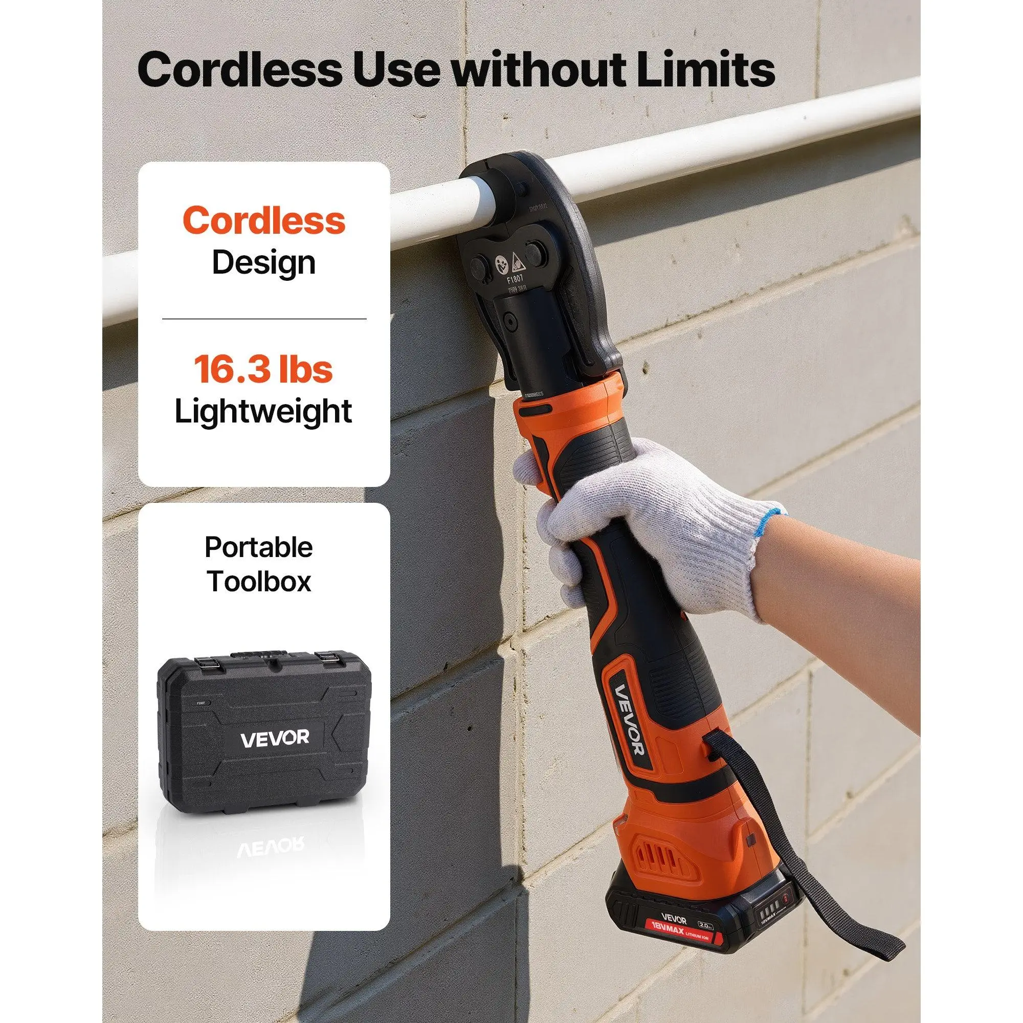 The VEVOR 18V cordless press tool kit is suitable for 1/2, 3/4, and 1 PEX pipe copper rings. Meeting the ASTM F1807 press standard and driven by a high-performance brushless motor, it delivers fast, leak-free crimps and secure connections. Cordless and portable for flexible, on-the-go use.