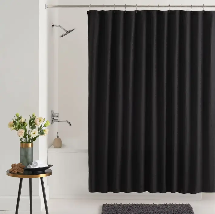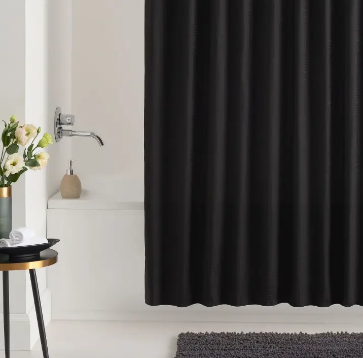Freshen up your bathroom with this stylish black shower curtain featuring a textured mosaic-weave design that adds depth and a modern touch to your space. The durable fabric offers both simplicity and elegance, making it perfect for a wide range of bathroom styles.