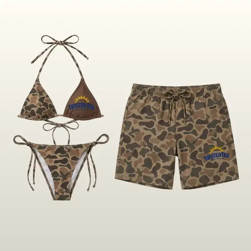 5. Camo Matching Couples Swimwear, String Bikini Set with Men’s Camouflage Swim Shorts Beach Party Outfit
