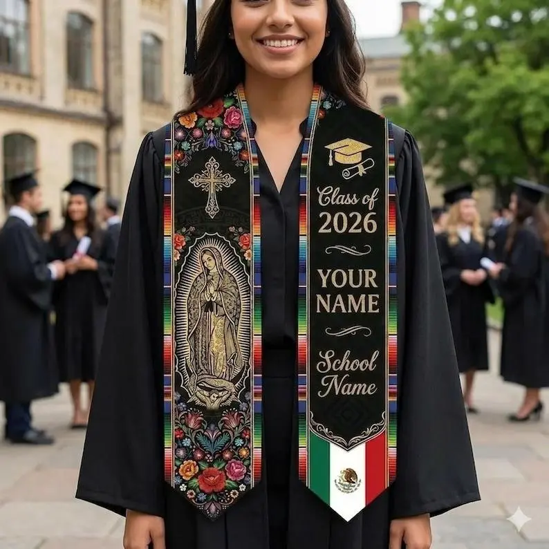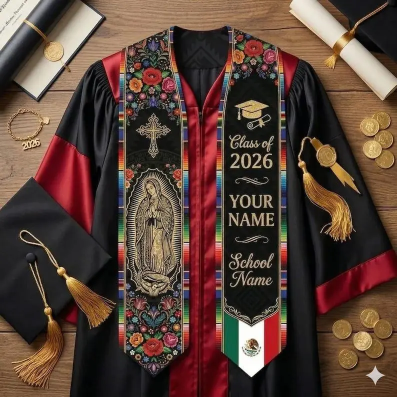 Personalized Mexican Graduation Stole 2026, Virgen de Guadalupe Floral Sash, Custom Name School Stole, Mexican Grad Gift