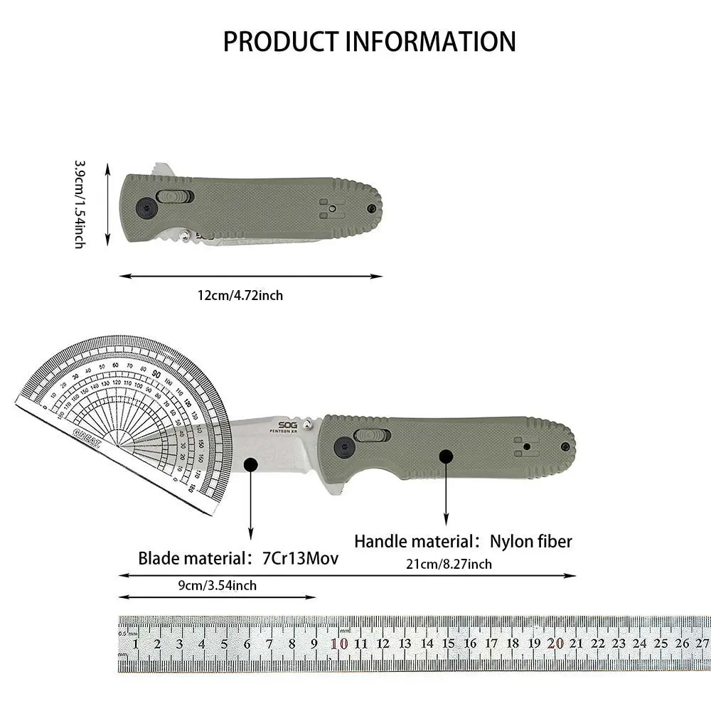 Total length of knife: 20.8CMHandle length: 12CMBlade length: 8.8CMBlade width: 2.7CMBlade thickness: 2.5MMBlade material: 7Cr13MovHandle material: nylon fiberHandle width: 3.2CMHandle thickness: 1.3CMNet weight of knife: 121GTotal weight of scabbard including packaging: 140 G