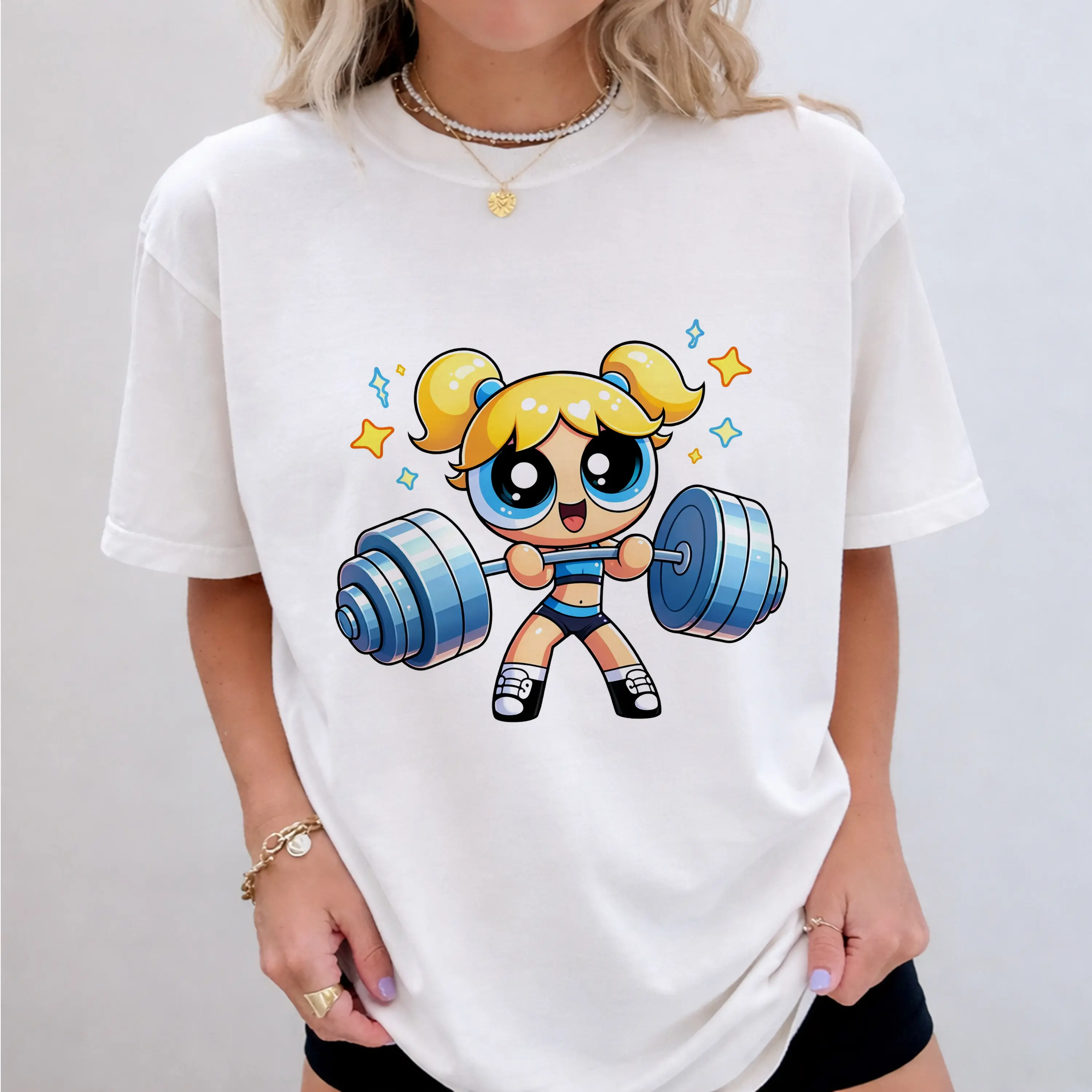 5. Powerpuff Gym Girl Shirt, Cute Cartoon Workout Tee, Kawaii Fitness Graphic T-Shirt, Apricot Vintage Washed Shirt, Y2K Aesthetic Streetwear, Strong Girl Gym Gift Womenswear Top