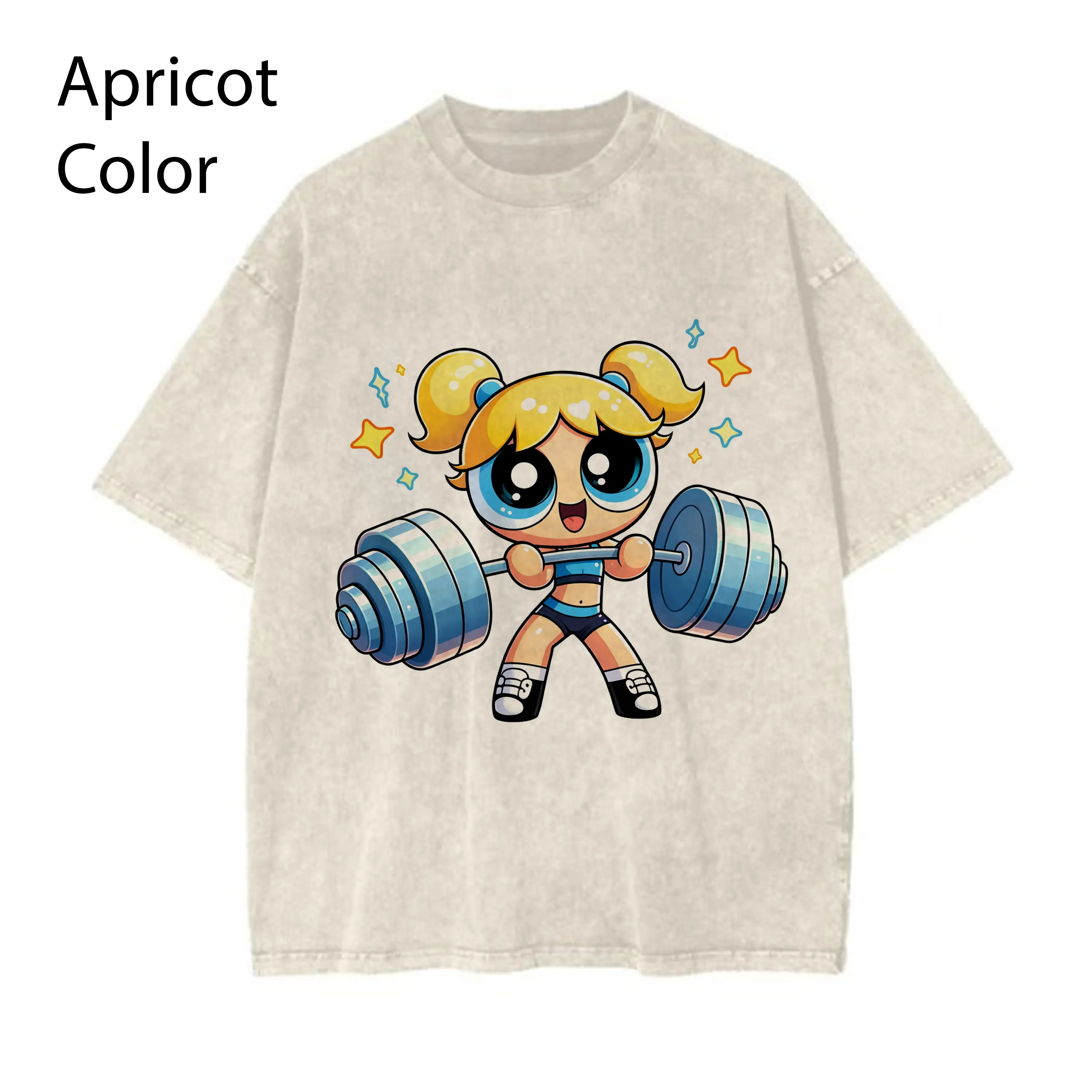 Powerpuff Gym Girl Shirt, Cute Cartoon Workout Tee, Kawaii Fitness Graphic T-Shirt, Apricot Vintage Washed Shirt, Y2K Aesthetic Streetwear, Strong Girl Gym Gift Womenswear Top
