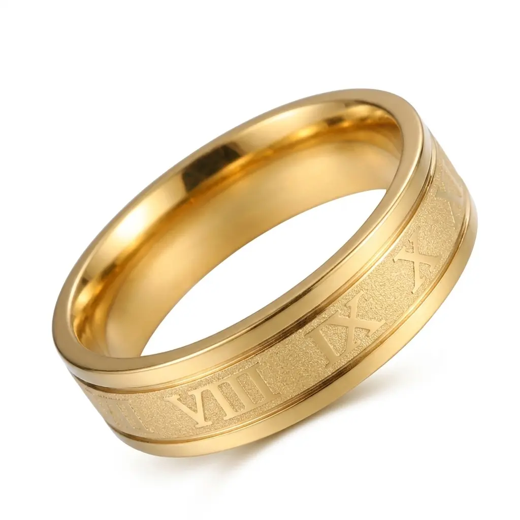 Elegant men’s ring crafted from stainless steel with a polished gold-tone finish. Features a classic Roman numeral pattern for a timeless and stylish look. Durable, comfortable to wear, and perfect for daily outfits or special occasions.