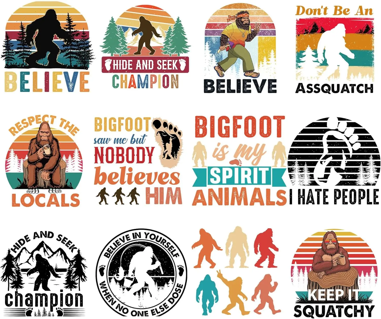 Sasquatch DTF Transfers Ready to Press, 12 Pcs Animal Iron on Transfers, Animal Iron on Decals Heat Vinly Sticker for T-Shirts Clothing Jackets Hats Backpacks DIY Crafts