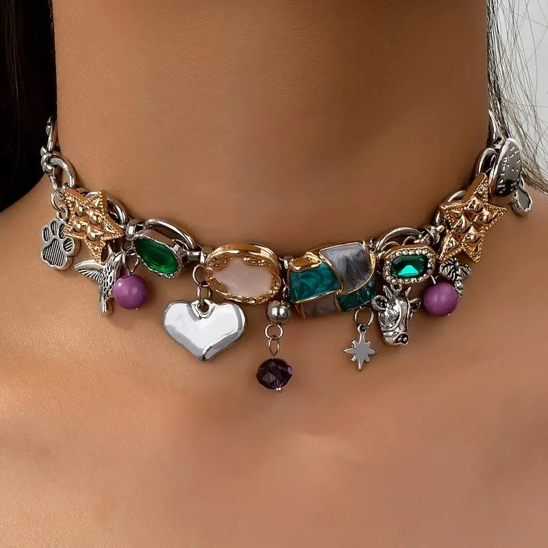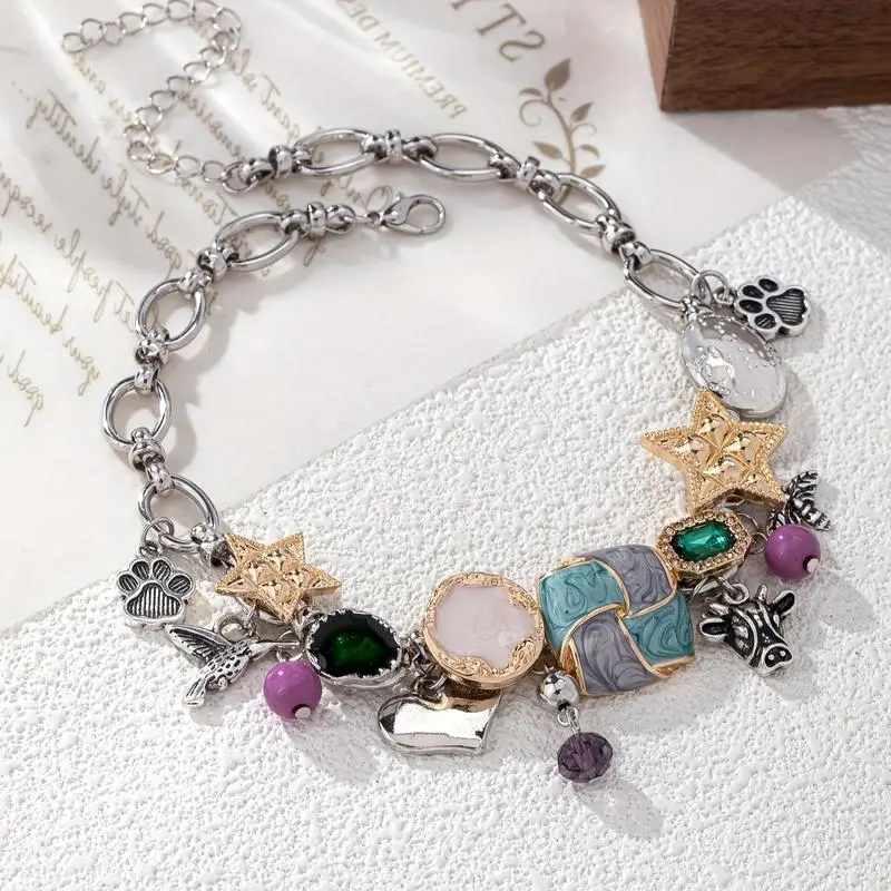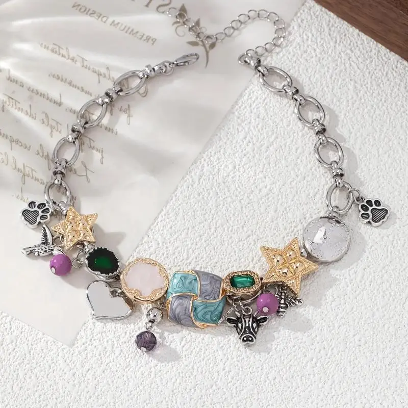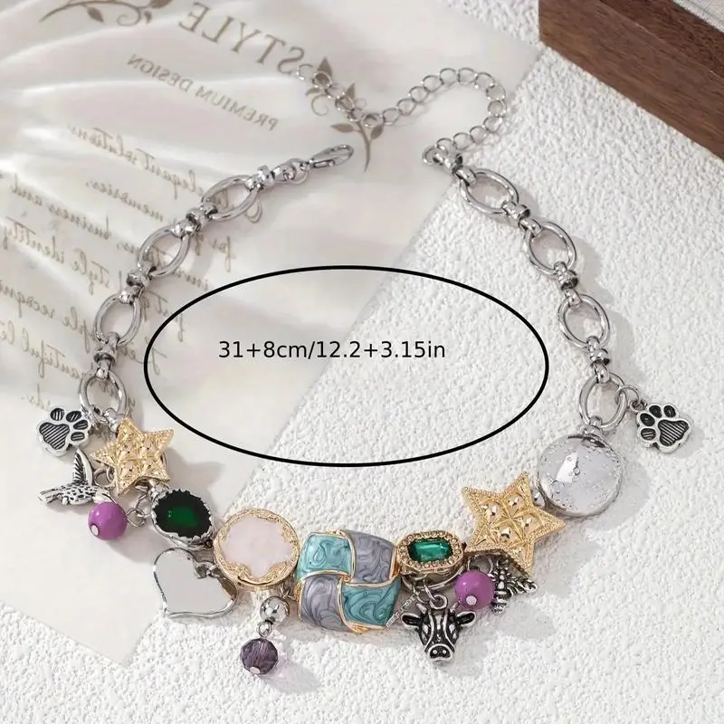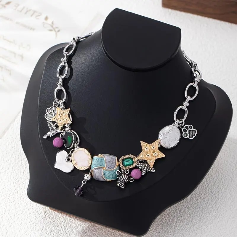 Trendy Bohemian Bull Head & Bee Pendant Necklace - Vintage Hand-Painted Enamel Star Charm, Stacked Chain Unique Craft Jewelry for Women's Casual Music Festival Outfits, Valentine's Day Holiday Gift Daily Accessory