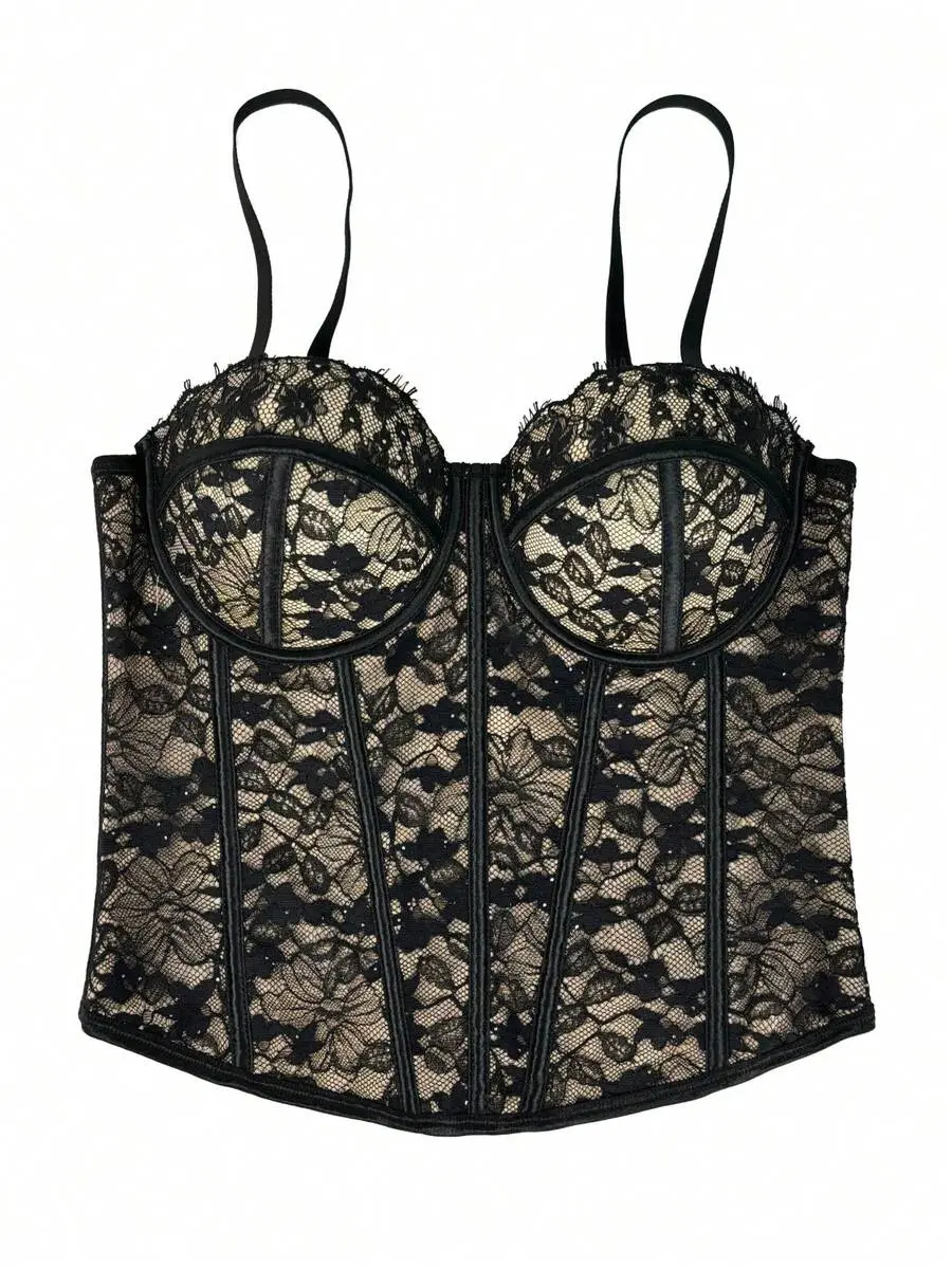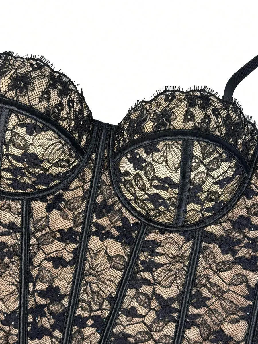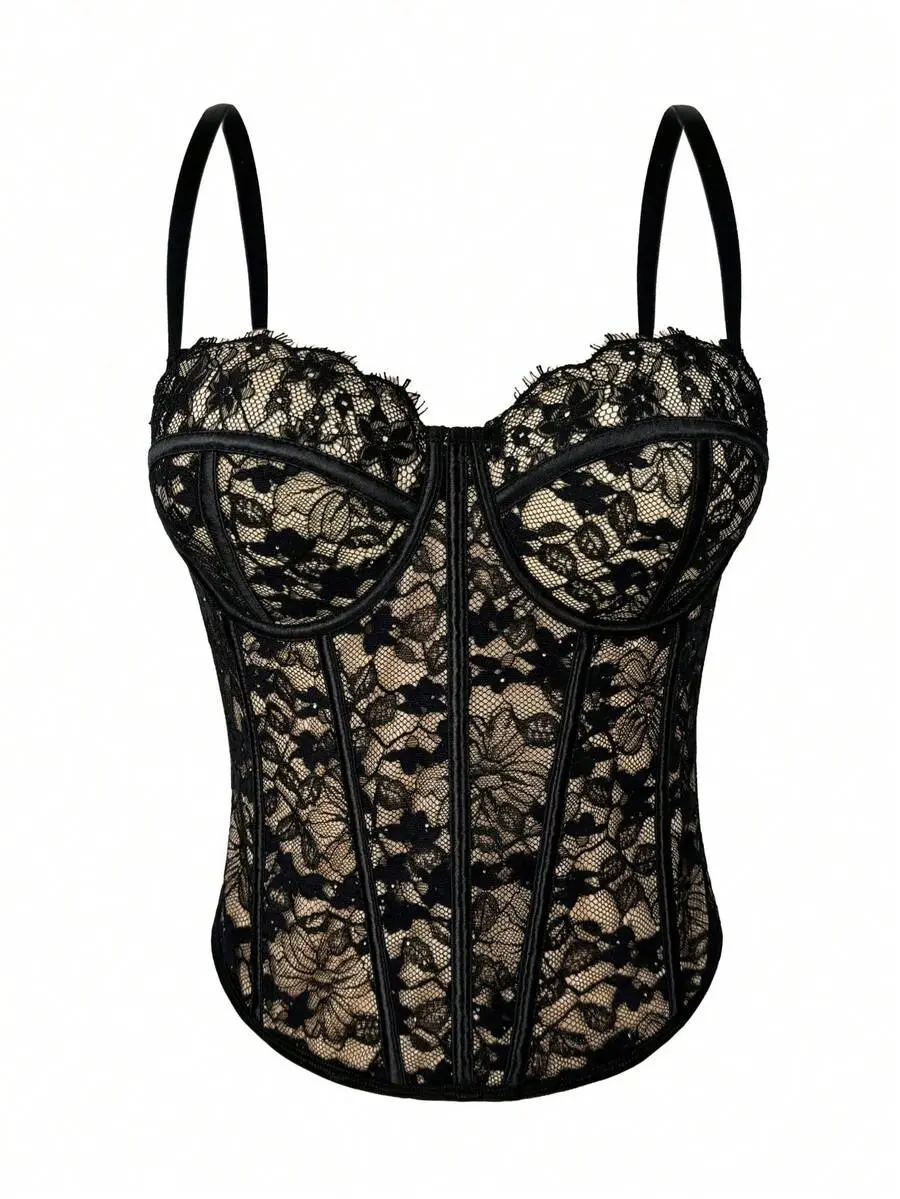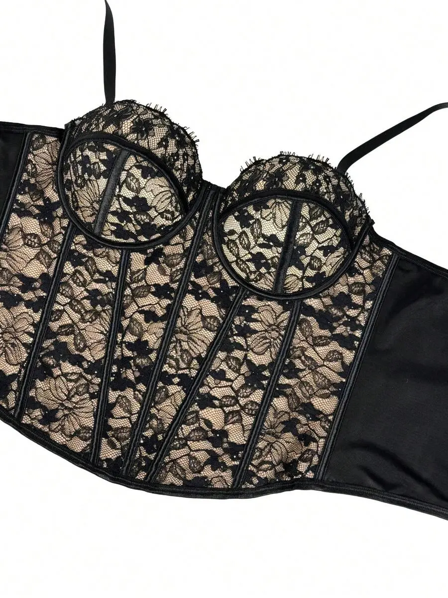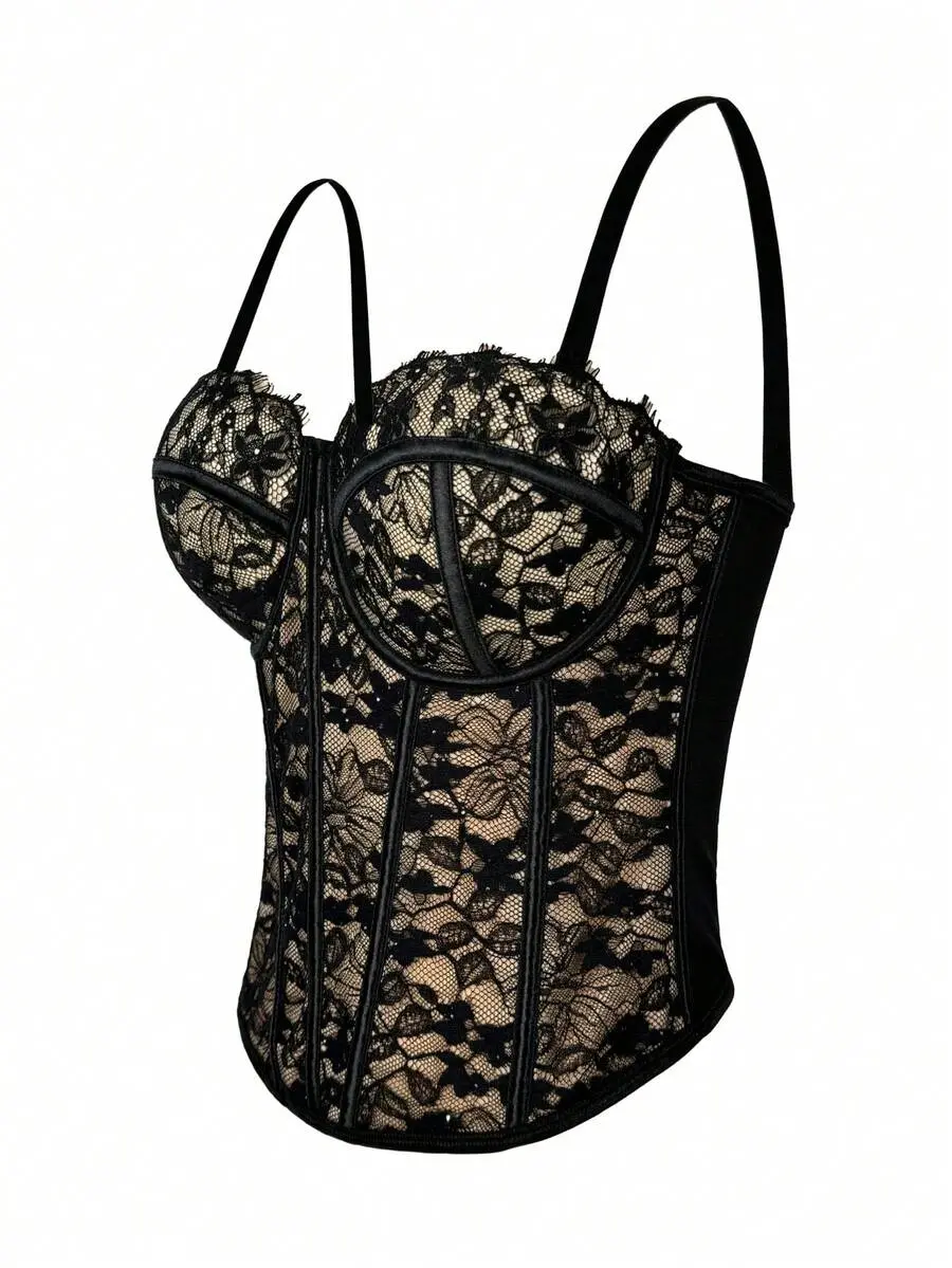ARTYOTI Women's Black Lace Floral Trim Bustier Corset Shapewear Casual Summer